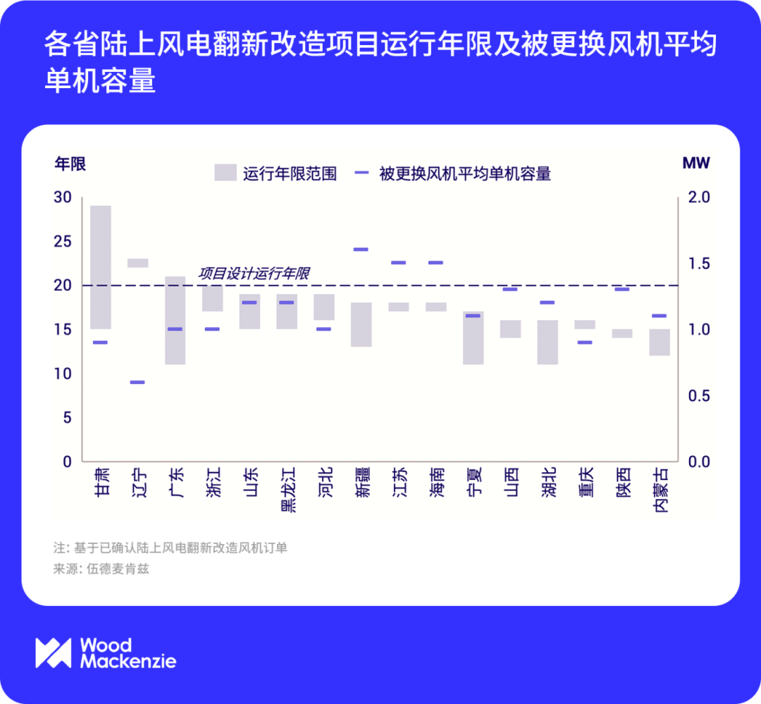 陆上风电翻新改造市场将在“十五五”期间迎来增长,并将在2030年后占陆上风电新增装机的15%。根据伍德麦肯兹对于各省已确认陆上风电翻新改造风机订单的统计分析,翻新改造项目的平均运行年限为16年,主要更换0.85MW和1.5MW级别的风电机组。随着优质风资源场址的逐渐稀缺,叠加电力市场化改革的持续推进,项目收益下行压力将推动开发商将目光投向被早期项目占据的更优风资源场址,进而带动翻新改造市场的长期增长。