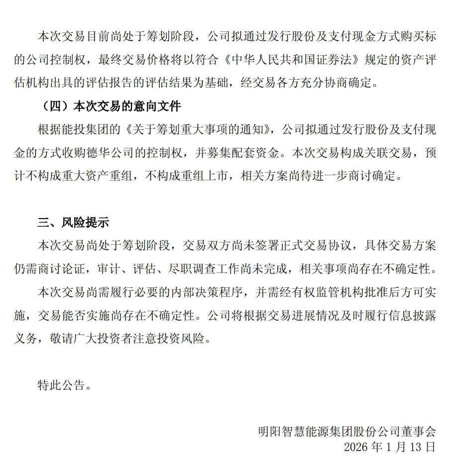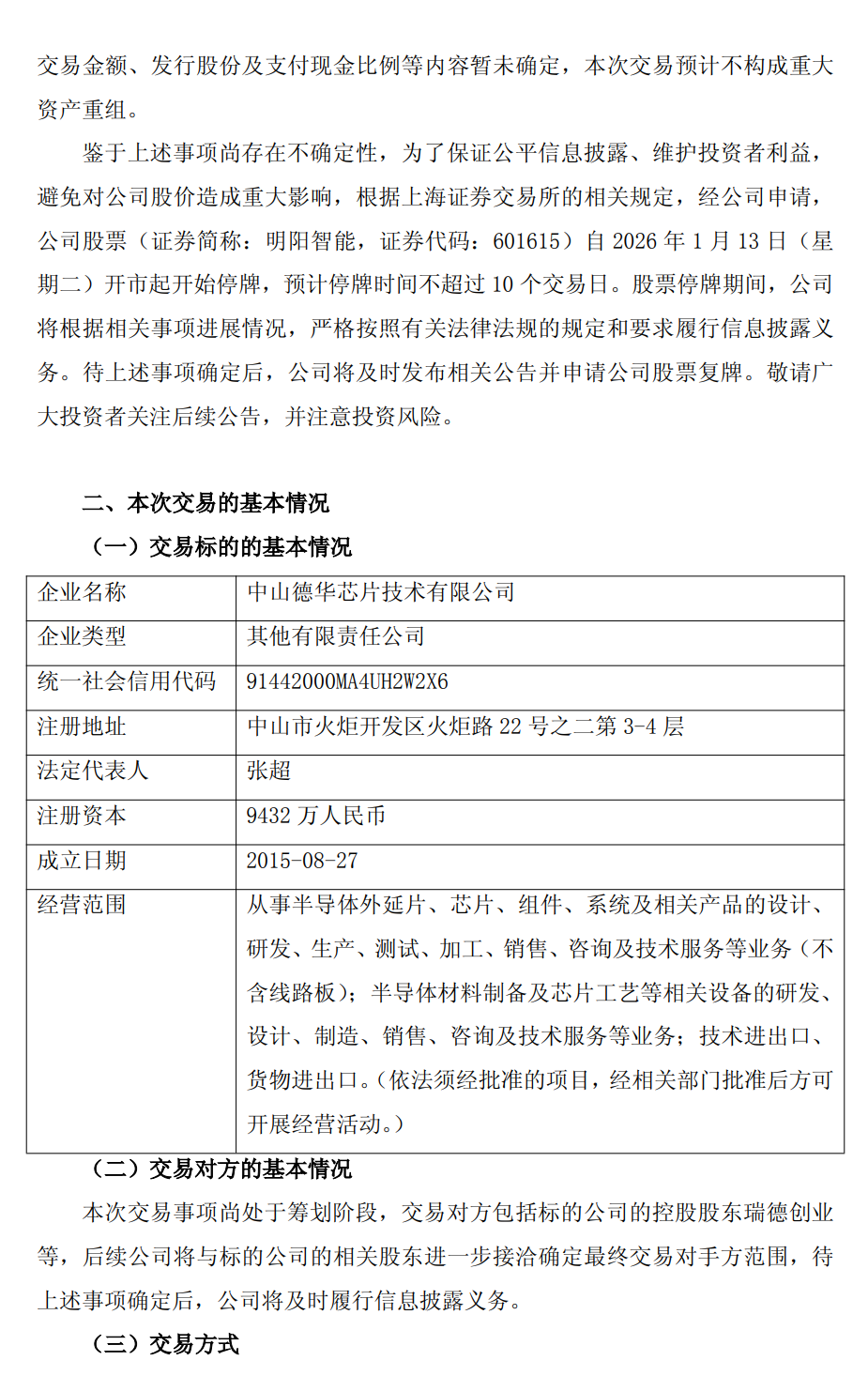 1月12日晚,明阳智能发布公告称,计划通过发行股份及支付现金的方式收购中山德华芯片技术有限公司(下称德华芯片)的控制权,并募集配套资金。该交易尚处于筹划阶段。