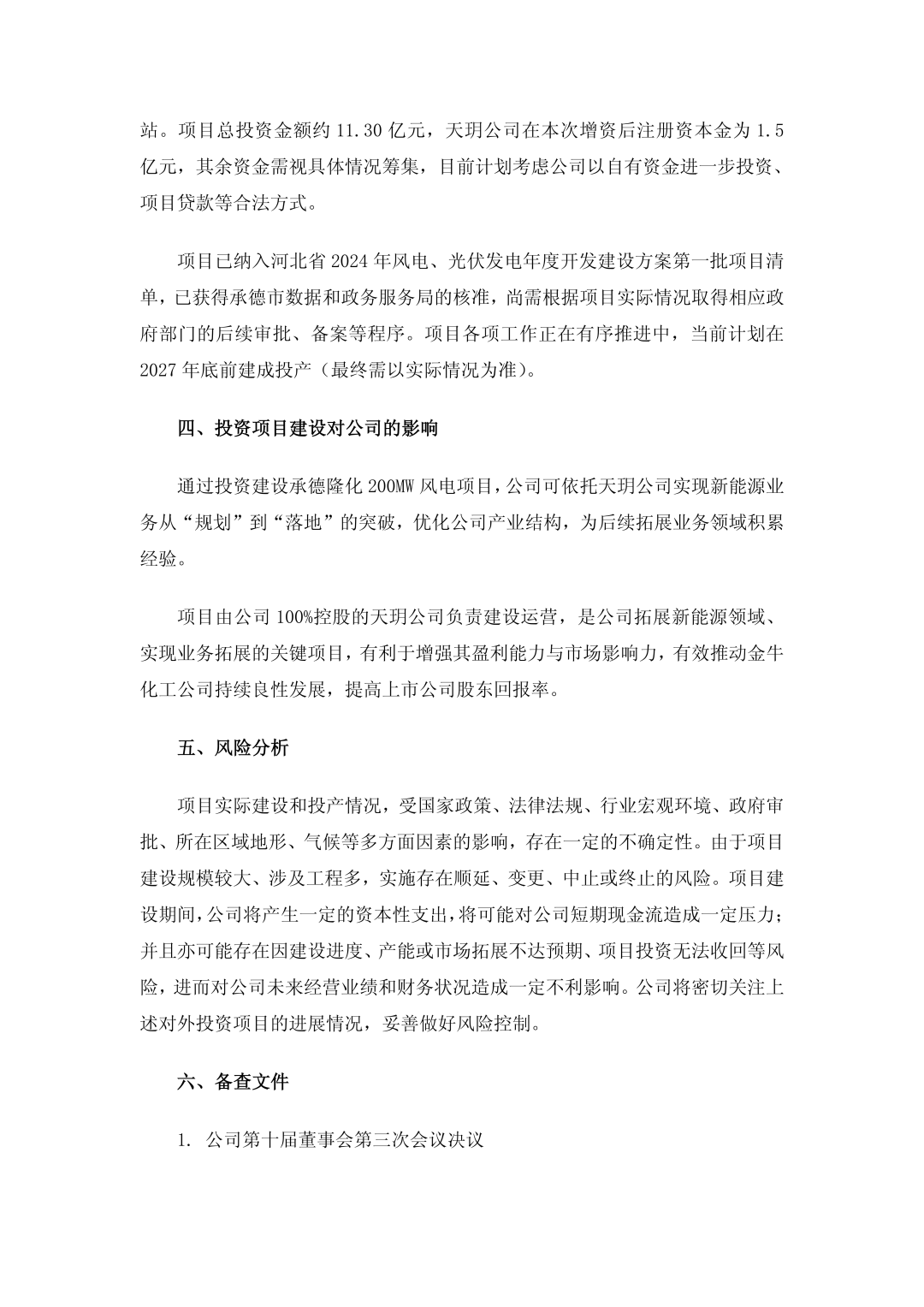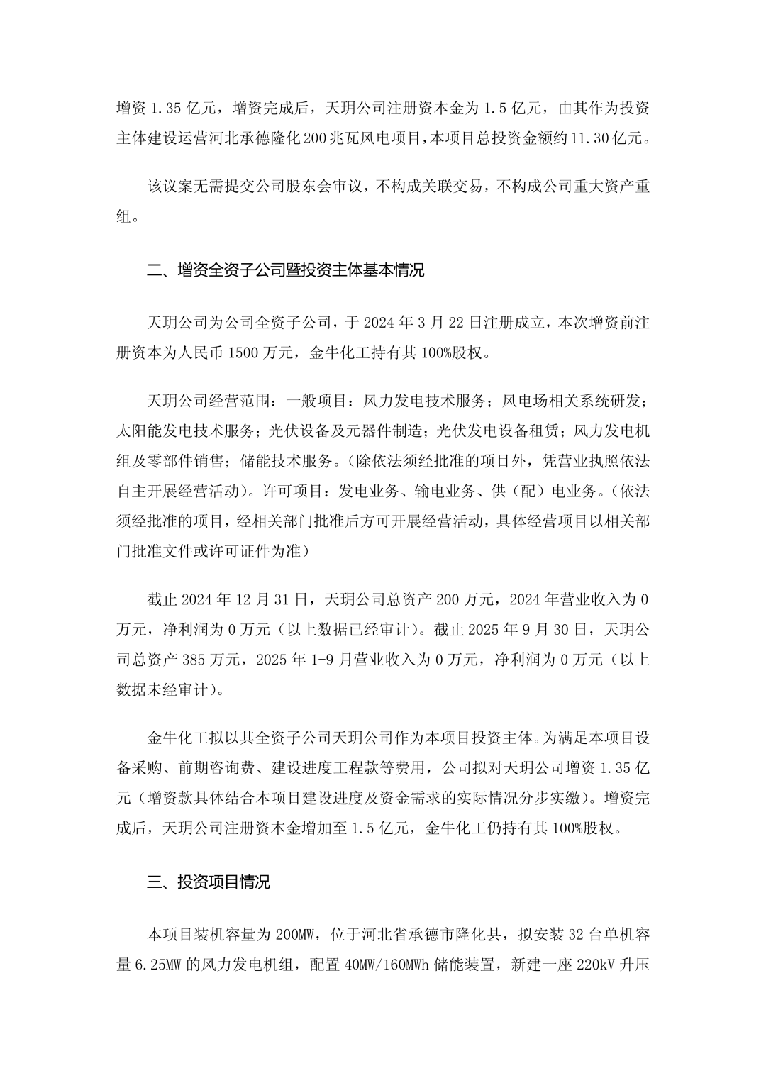 公告披露,金牛化工拟以自有资金对全资子公司河北高速天玥新能源有限公司(以下简称“天玥公司”)增资1.35亿元,增资完成后,天玥公司注册资本金为1.5亿元,由其作为投资主体建设运营河北承德隆化200兆瓦风电项目。