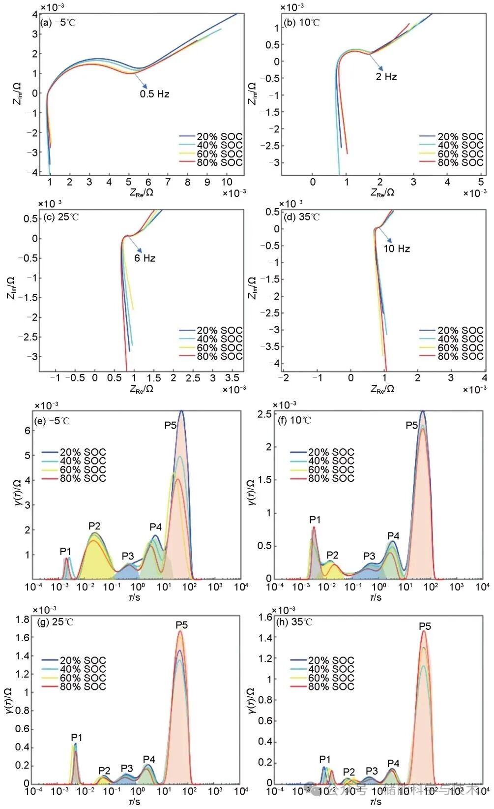 电化学阻抗谱在阻抗复平面的几何表现形式通常为若干半圆和一条近似与横轴成45°的斜线,大容量磷酸铁锂电池测得的EIS只有一个明显的圆弧,如图1(a)~(d)所示。这是因为电池内部极化反应的多样性及复杂性,半圆呈现出相互交叠的现象,无法依据阻抗复平面图判断极化反应个数。而弛豫时间分布(DRT)方法无须依赖先验知识或预设等效电路模型,即可将EIS谱图中高度重叠的多个极化过程分辨开,从而达到识别体系极化过程数量和极化电阻大小的目的。如图1(e)~(h)所示,对不同温度下的EIS进行DRT分析,阻抗峰P1、P2分别归属于SEI膜阻抗和电荷转移阻抗,阻抗峰P3~P5均归属于固相扩散阻抗。低温时,反应动力学活化能壁垒升高,电解液离子电导率下降,电荷转移阻抗急剧增大,主导了该温度下的电池极化过程。特征峰P1和P2的时间常数满足log(τsei/τct)<1时,SEI膜形成与电荷转移过程的时间常数耦合,导致阻抗复平面的圆弧合并。