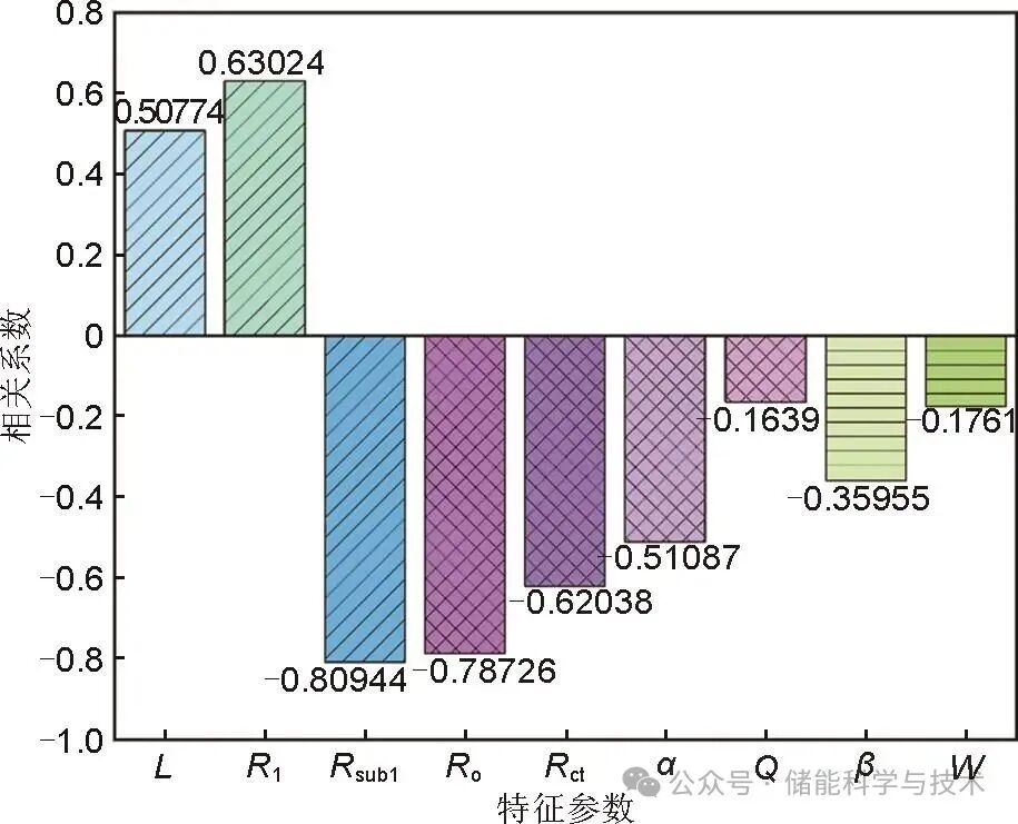 图5展示了25℃、60%SOC的标准工况下9个特征参数与SOH的皮尔逊相关系数。其中Rsub1、欧姆内阻(Ro)与电荷转移阻抗(Rct)分别呈现-0.80944、-0.78726和-0.62038的负相关性,反映了电池内部导电网络退化和电极界面电荷转移阻力增大现象。扩散相关参数(β和W)的负相关性(-0.35955和-0.1761)说明锂离子固相扩散能力随容量衰减而下降。而常相位元件参数(α和Q)的相关性(-0.51087和-0.1639)与Ro、Rct相比,与老化机制的关联性较弱。该结果验证了分段ECM模型提取的特征参数具有明确的物理意义,其中Rct、Ro可作为SOH评估的核心指标。