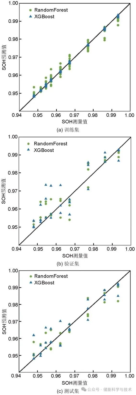 近期研究表明,EIS结合机器学习在SOH评估中具有显著潜力。文献[28]指出,基于XGBoost的方法仅需少量特征即可实现90%的预测精度,尤其适合嵌入式BMS应用。相较于该研究仅验证单一模型,本研究进一步系统对比了梯度提升决策树(extreme gradient boosting, XGBoost)与随机森林及线性模型在本实验条件下的性能差异。如图7所示,通过将数据集按10∶3∶3的比例划分为训练集、验证集和测试集,本研究比较了XGBoost和随机森林在不同数据集上的表现。XGBoost在训练集上表现出极高的拟合精度(R2 = 0.9991),然而在验证集(R2 = 0.7683)和测试集(R2 = 0.8739)上的性能明显下降,表现出一定的过拟合风险。相比之下,随机森林在各个数据集上都保持了较为稳定的表现,训练集(R2 = 0.9774)、验证集(R2 = 0.8555)和测试集(R2 = 0.8981)的预测精度较为一致,且在泛化能力上明显优于XGBoost。考虑到XGBoost的过拟合问题和较大的性能波动,最终选择随机森林作为本研究的最佳模型,因为它在保证较高精度的同时,具备更强的稳定性和泛化能力。