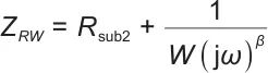 高频对Warburg元件影响较小,高频和中频阶段的阻抗可简化为电阻Rsub2,构建如图3(c)所示的低频段阻抗模型RW,阻抗表达式如下: