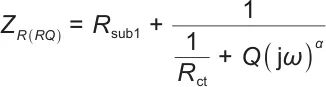将高频段阻抗模型(RL)R简化为电阻Rsub1,构建如图3(b)所示的中频段阻抗模型R(RQ),阻抗表达式如下: