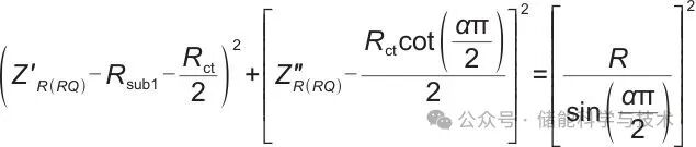 按照该方程作图可得一个圆,在阻抗复平面中为圆心在第四象限、轨迹在第一象限的圆弧,如图3(b)所示,获取特征参数的方法与高频段方法一致,得到特征参数Rsub1、Rct、α、Q,其中Rsub1数值上与阻抗复平面中的阻抗谱与实轴的交点(即欧姆内阻)等同。
