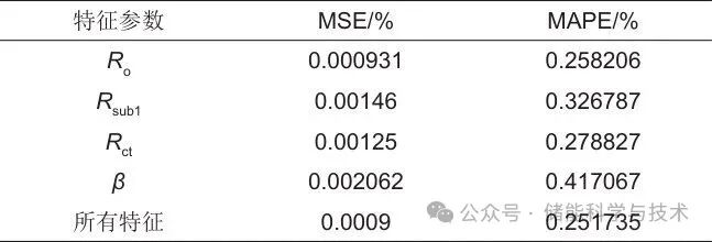 将上述Ro、Rsub1、Rct、β和所有特征分别作为电池SOH评估系统的特征输入模型,计算得到的SOH评估值和SOH真实值对比如图9所示。如表1所示,对评估的结果进行量化。从表中结果可以看出,基于Ro的评估效果优于Rsub1。虽然这4个单特征参数对SOH的敏感程度不一样,但是彼此的误差分析差距并不大,因此均可以作为电池健康参数实现SOH的高精度评估。
