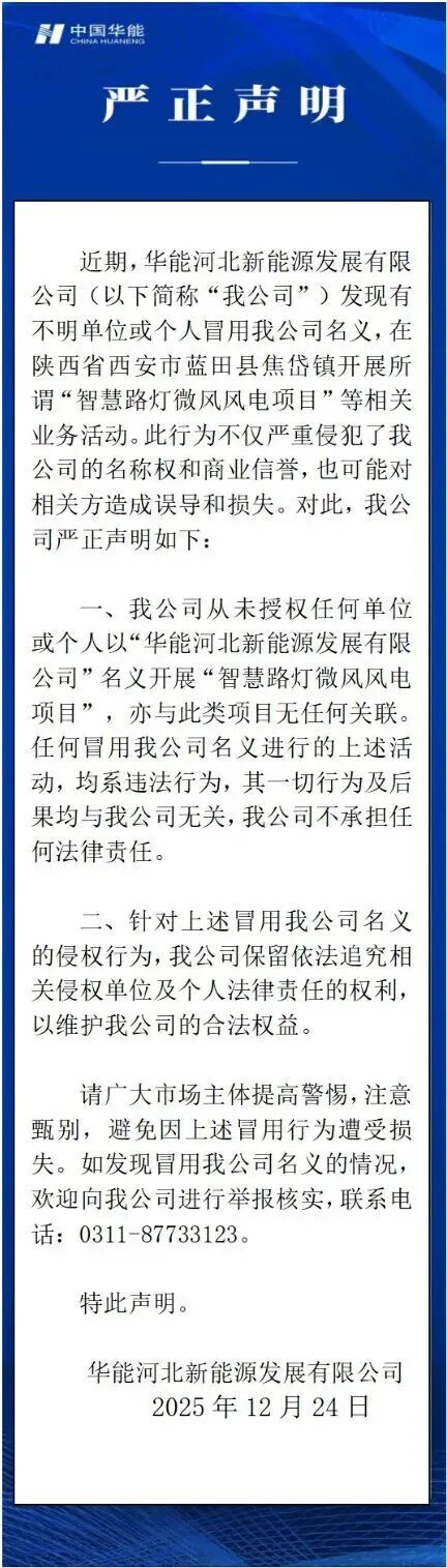 此前,1月24日,华能河北新能源发展有限公司已发布一次声明称,发现有不明单位或个人冒用华能河北新能源发展有限公司名义,在陕西省西安市蓝田县焦岱镇开展所谓“智慧路灯微风风电项目”等相关业务活动。此行为不仅严重侵犯了华能河北新能源发展有限公司的名称权和商业信誉,也可能对相关方造成误导和损失。