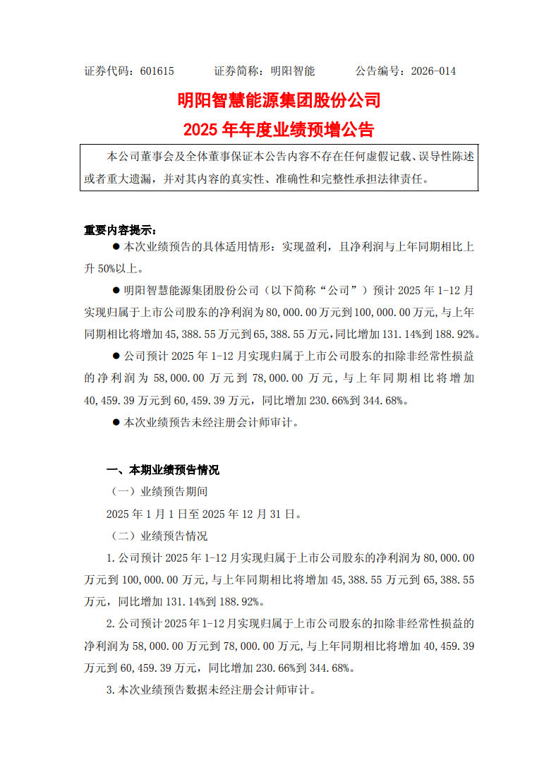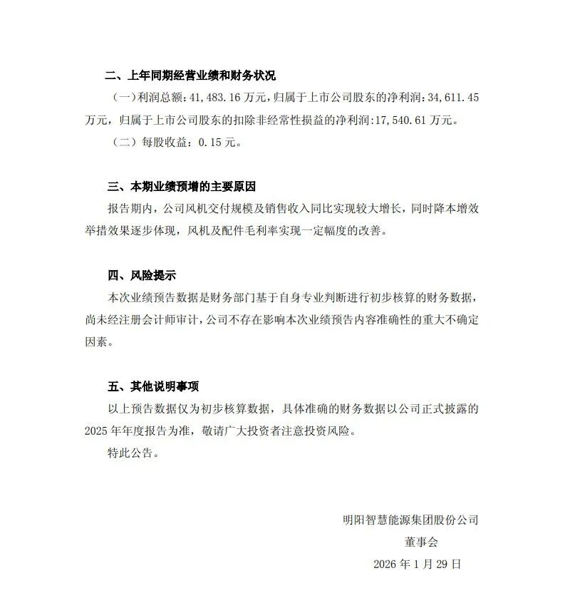 北极星风力发电网获悉,刚刚,明阳智慧能源集团股份公司(简称“明阳智能”)发布2025年年度业绩预增公告,核心财务指标呈现爆发式增长。
