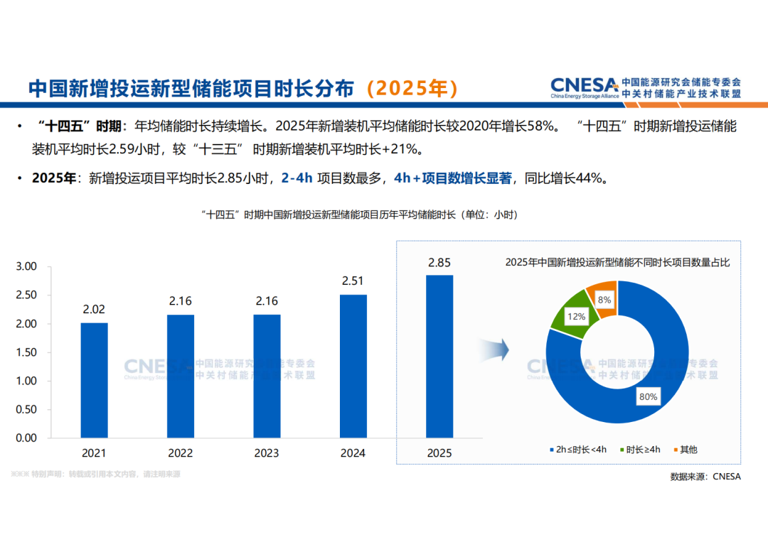 陈海生表示,新型储能累计装机的平均时长在2021-2025年呈缓慢上升趋势,由2.11小时逐步增至2.58小时。2026年起,时长提升明显加速,预计至2030年将达到3.47小时。这一转折反映了储能技术持续进步与市场对长时储能需求的增强,行业正朝着能量时移、系统调节等更注重能量容量的应用场景深化发展。