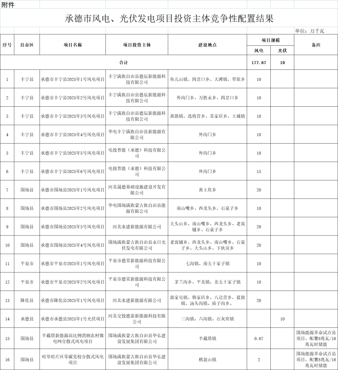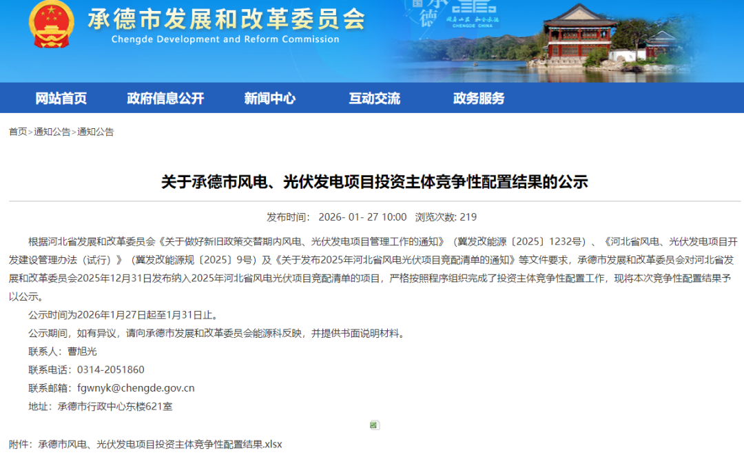 1月27日,河北省承德市发改委发布《关于承德市风电、光伏发电项目投资主体竞争性配置结果的公示》。