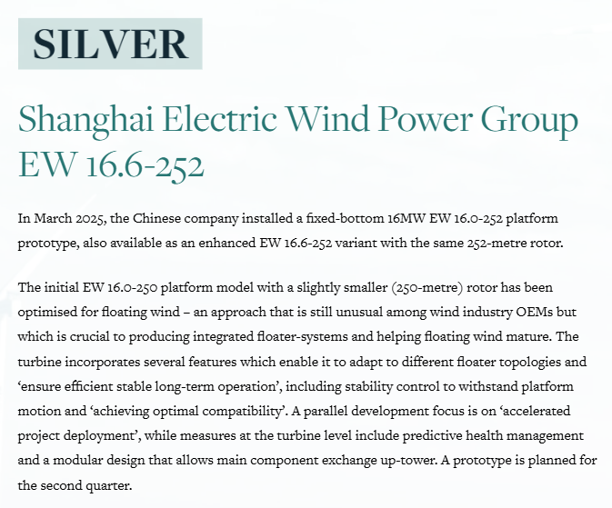 近日,国际权威风能杂志Windpower Monthly揭晓“2025年度最佳风电机组”名单。电气风电共有3款海陆产品上榜,分别入选全球最佳陆上风电机组(6.9MW以下)、全球最佳陆上风电机组(7.0MW以上)以及全球最佳海上风电机组。其中,EW16.0-252海上机组摘获全球最佳海上风电机组榜单银奖。