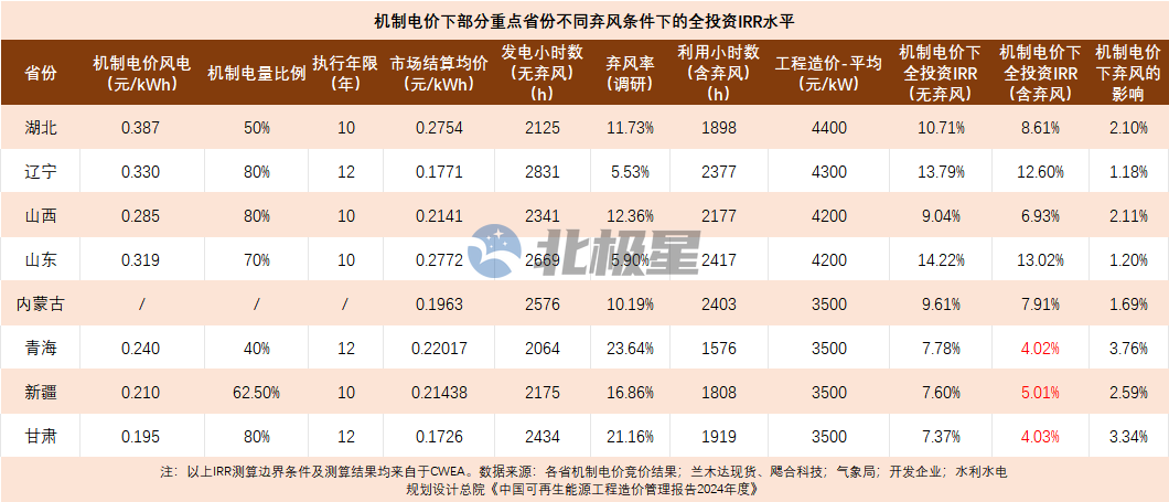 不享受机制电价的项目,以当前交易电价水平,无弃风因素下仅两个省份全投资收益率低于6%;考虑实际弃风率,一半以上省份全投资收益率低于6%。