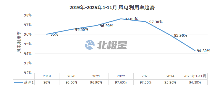 136号文之于行业的震荡,是一次不亚于"平价"初期的深刻讨论和对未来不确定性的担忧。但从产业发展数据来看,一个更严峻的现实已经横亘眼前:根据国家能源局数据,2024年全国风电利用率为95.9%,同比下降1.4个百分点,2025年1-11月,全国风电利用率为94.3%,呈继续下降趋势。风光发电利用率的下降也同步体现在设备利用小时上,中电联数据显示,2024年,全国并网风电利用小时数为2127小时,同比降低107小时。