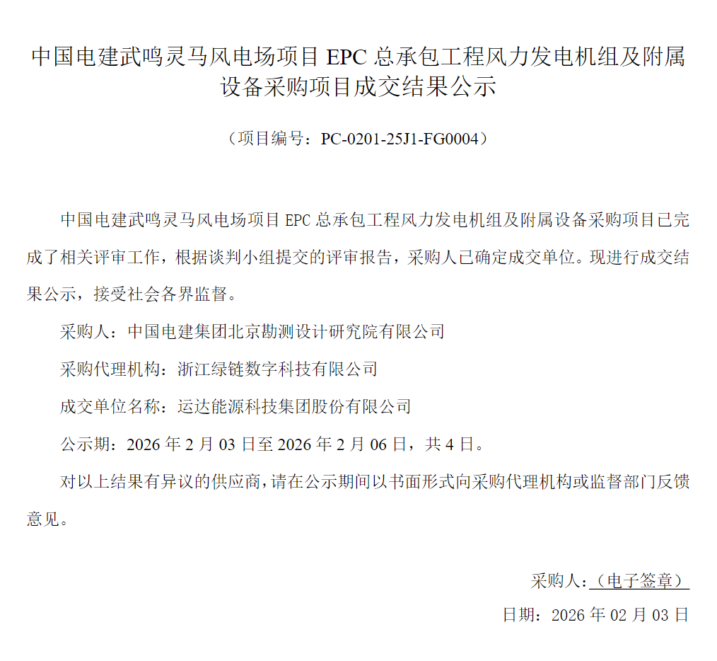 北极星风力发电网获悉,2月3日,中国电建武鸣灵马风电场项目EPC总承包工程风力发电机组及附属设备采购项目成交结果公示,运达股份中标。