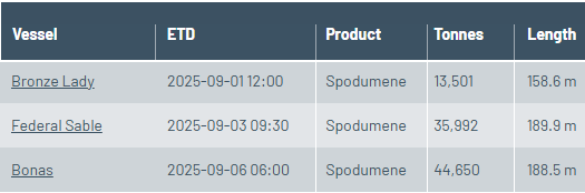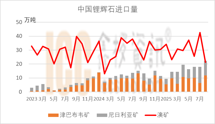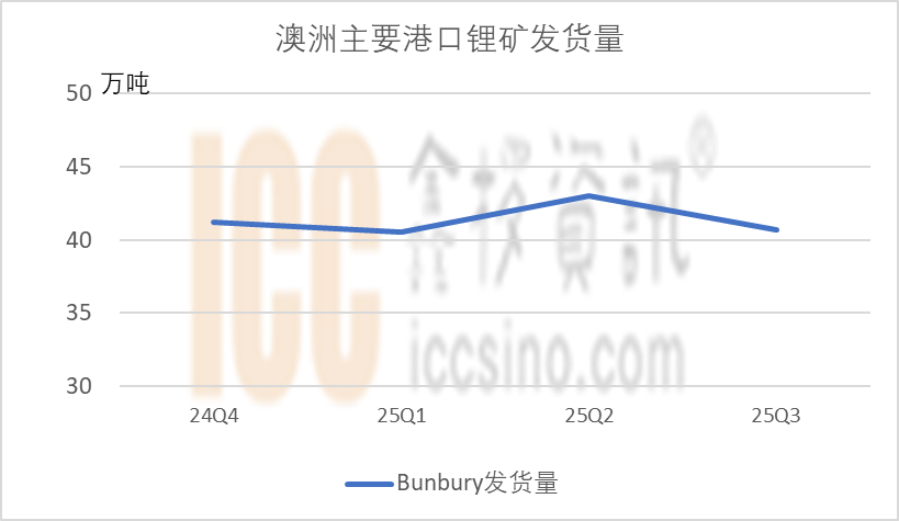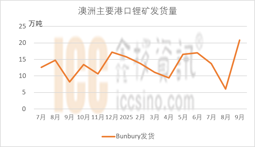 据中国海关数据显示,8月中国从澳洲进口锂辉石21.2 万吨,环减50.5%。而根据澳洲港口数据,2025年8-9月份,澳大利亚锂矿主要港口Bunbury的发货量确实出现了较大波动。