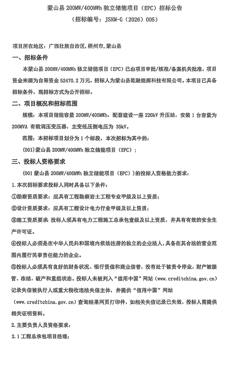 北极星储能网讯:2026年2月4日,蒙山县乾融能源科技有限公司发布蒙山县200MWW/400MWh独立储能项目EPC招标公告,项目总投资52470.2万元,合单价1.31元/Wh。