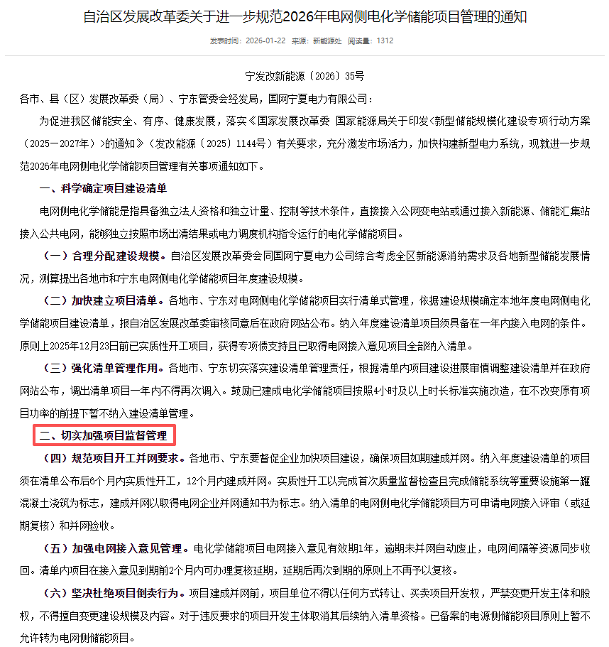 宁夏亦于1月20日正式出台储能项目管控新规,通过全流程严格监管补齐前期规划与建设管理短板。