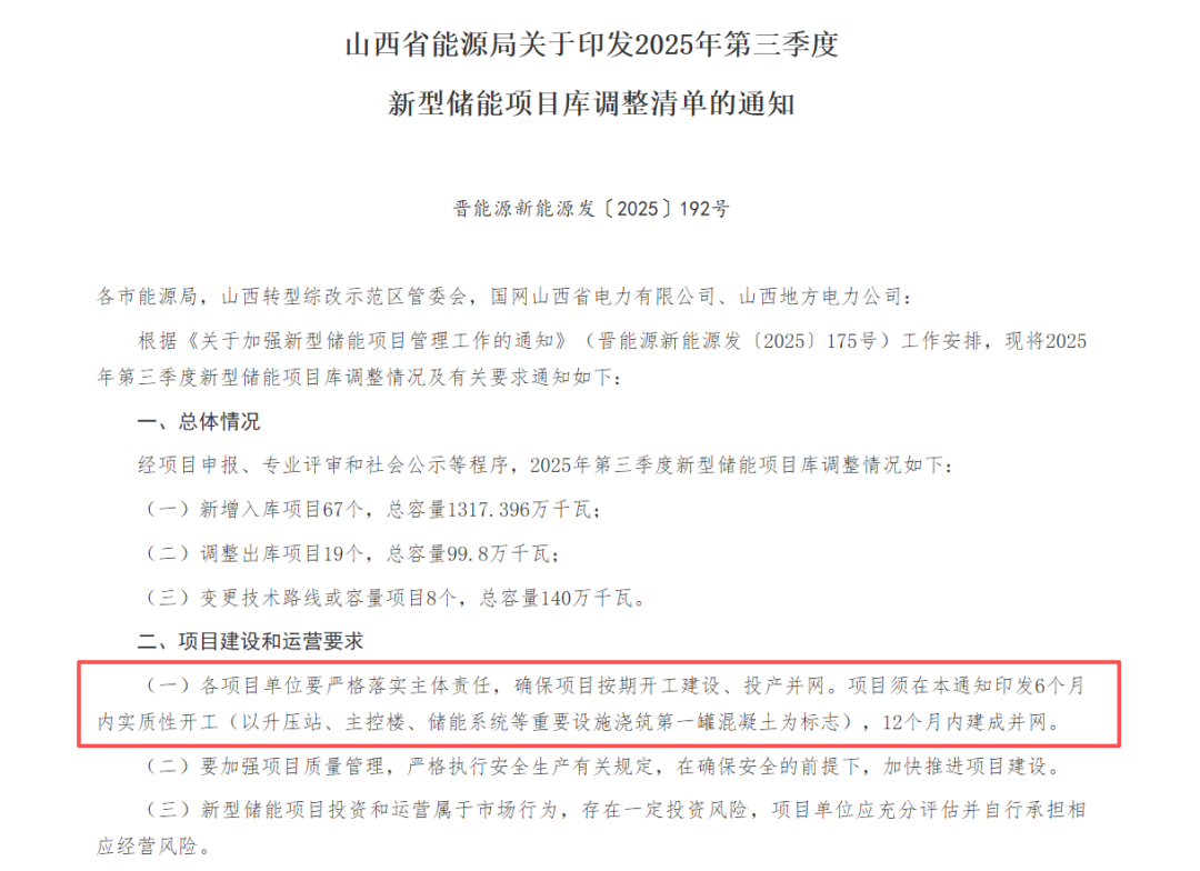 为有效遏制行业乱象、健全项目全周期管理机制,山西在最新管理规定中明确,列入建设计划的储能项目,在建设期及全容量并网后5年内不得擅自转让,严厉打击指标炒作与违规交易行为;同时要求入库项目须在6个月内实现实质性开工,12个月内建成并网,并将升压站、主控楼、储能系统等关键设施浇筑第一罐混凝土,作为实质性开工的认定标准。
