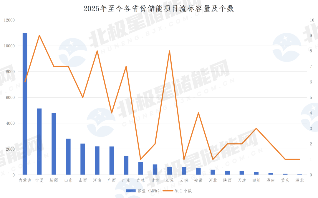 从省份来看,流标现象高度集中在内蒙古、宁夏等西北资源型省份,其中内蒙古以超10GWh的废标容量成为规模最大的省份,而宁夏则以9个项目成为废标频次最高的省份。