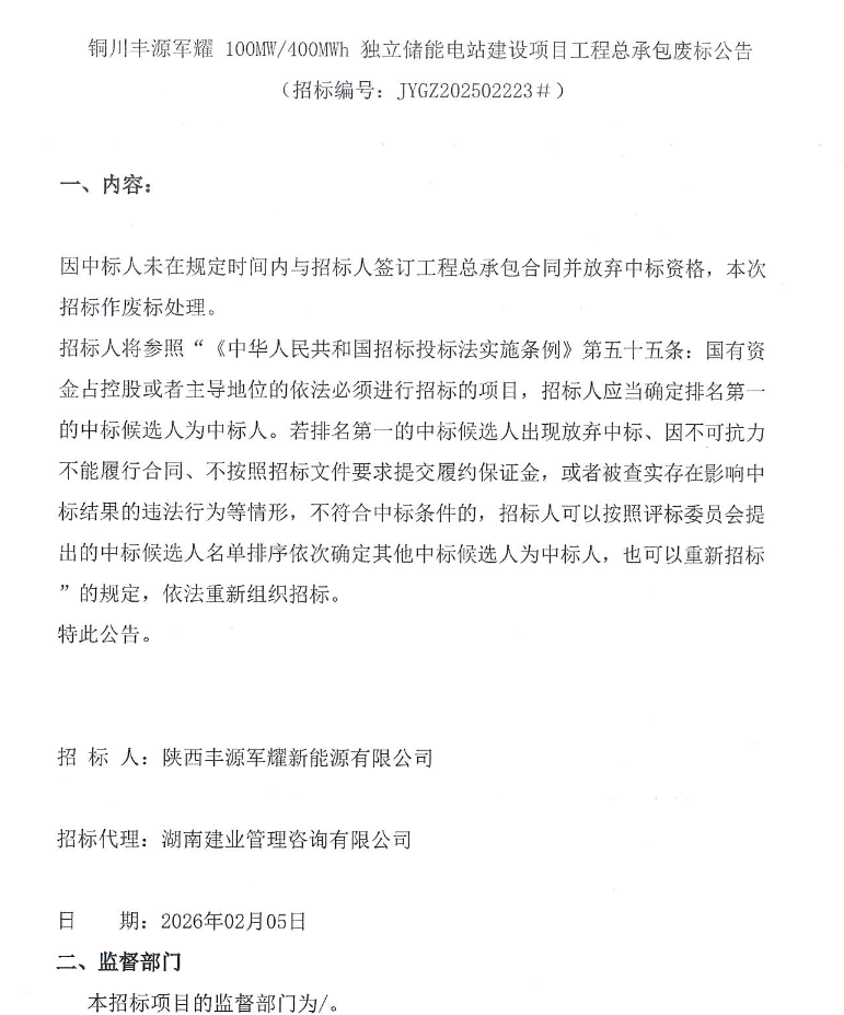 北极星储能网讯:2026年2月5日,陕西铜川丰源军耀100MW/400MWh独立储能电站建设项目工程总承包发布废标公告,因中标人未在规定时间内与招标人签订工程总承包合同并放弃中标资格,本次招标作废标处理。