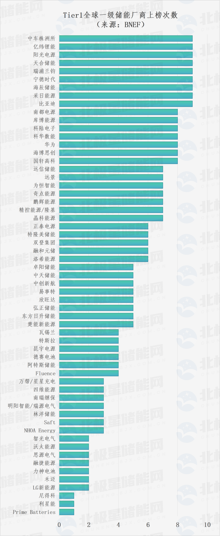 北极星储能网观察到,自2024年第一季度Tier 1榜单推出以来,包含比亚迪、采日能源、海辰储能、宁德时代、瑞浦兰钧、天合储能、阳光电源、亿纬锂能、中车株洲所在内的9家企业9次榜单始终在列,无一次落榜。