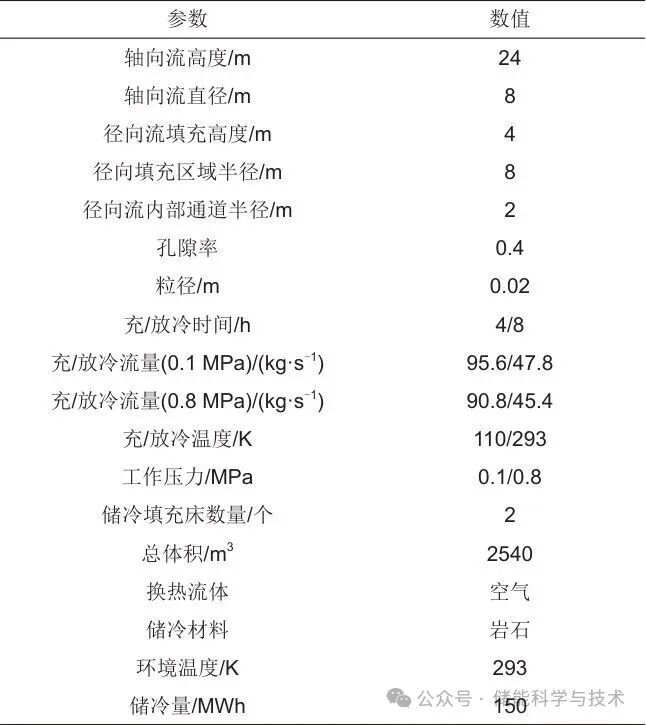 本研究以基于10 MW/80 MWh的液态空气储能电站,对比了轴向流与径向流填充床的性能。按照系统充冷、储冷及放冷时间4 h、8 h、12 h进行分析,表1给出了储冷填充床入口冷量数据。