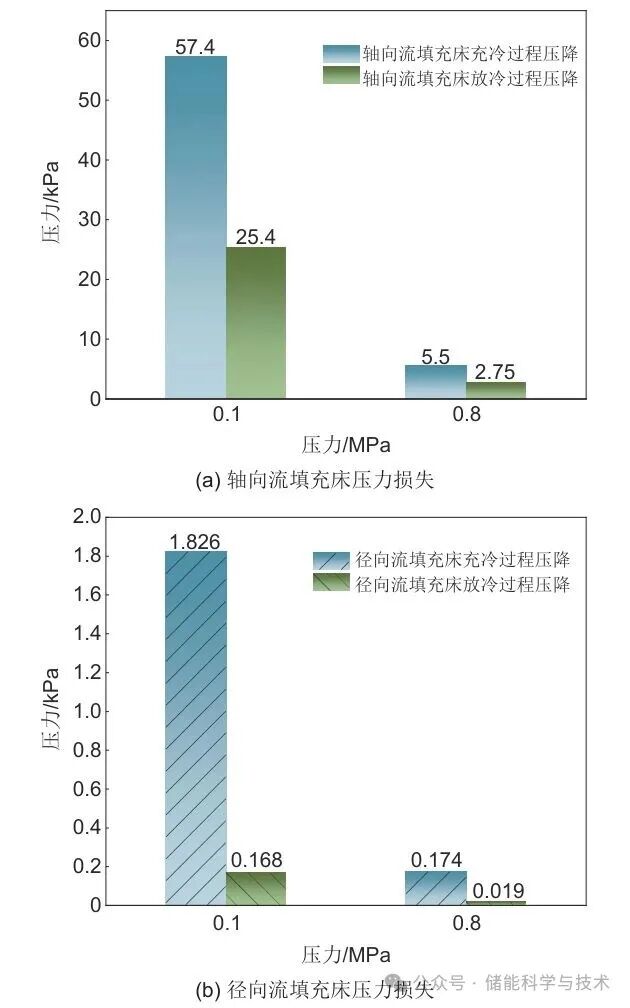 本研究模拟并分析了其在充、放冷过程中的压降数据,比较了轴向流与径向流填充床在不同工作压力下的流动阻力特性。图5为不同运行工况下填充床压力损失图。如图5(a)所示在0.1 MPa工况下,轴向流在充冷与放冷过程中的压降分别为57.37 kPa和25.38 kPa,而图5(b)中径向流对应压降仅为1.83 kPa和0.17 kPa,轴向流填充床的压降远高于径向流。在0.8 MPa工况下,轴向流的充冷与放冷压降分别为5.5 kPa和2.75 kPa,而径向流仅为0.17 kPa和0.019 kPa,压降差为5.3 kPa和2.73 kPa。
