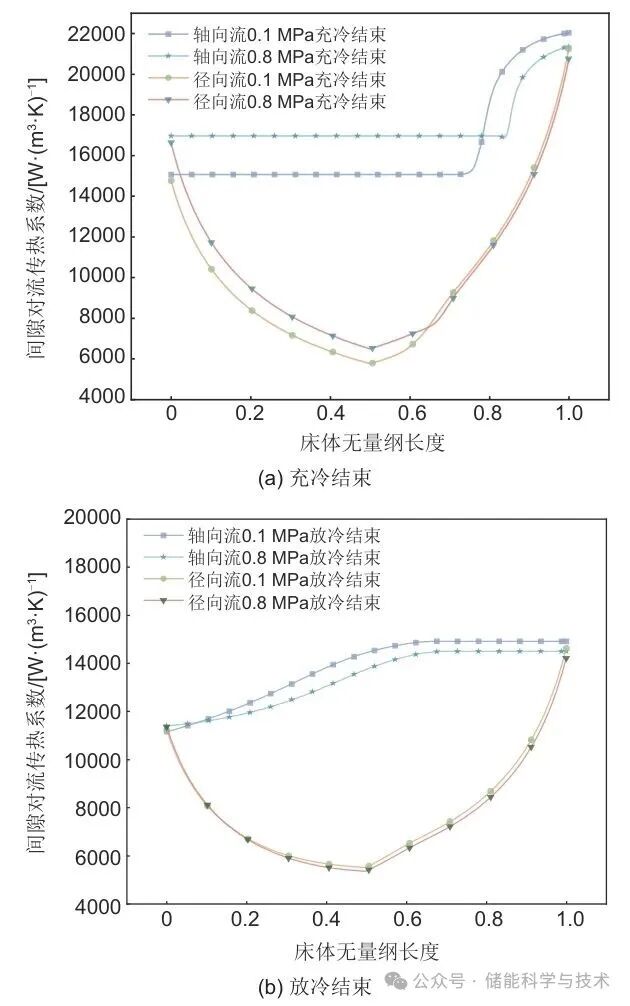 间隙对流传热系数主要受努赛尔特数的影响,而努塞尔特数又随雷诺数变化。因此流速与密度成为决定其大小的关键因素。图6分别揭示了充放冷过程结束阶段间隙对流传热系数随流体流动路径无量纲位置的变化。如图6(a)所示,在充冷过程结束阶段,轴向流在温跃层区域内流速显著增加,在0.1 MPa工况下,流速由1.48 m/s提升至3.87 m/s,在该区域气体密度同速度上升而下降。根据雷诺数定义,雷诺数随流速升高而升高,随密度下降而下降,在充冷过程结束阶段,流速增长速率强于密度下降速率,流速与密度共同作用下使得间隙对流传热系数较0.8 MPa下更强。对于径向流来说,充冷过程结束阶段分别在第一与第二储罐分别出现了两处局部强换热区。这主要归因于入口和出口处的流动截面积相对较小,导致局部流速升高,从而增强了换热能力。整体来看,径向流的间隙对流传热系数在不同工况下的变化幅度小于轴向流,表现出更强的稳定性。如图6(b)所示,在放冷过程结束阶段,间隙对流传热系数的变化趋势与充冷过程结束阶段具有相似性。对于轴向流和径向流而言,流速变化对传热系数的影响显著大于密度变化的影响。因此,在0.1 MPa工况下,由于流速较高,即使气体密度较低,依然能够维持较高的雷诺数,从而实现更强的对流换热效果。平均对比下,0.8 MPa工况下虽具有较高的气体密度,但受限于较低的流速,其间隙对流传热能力整体较弱。因此0.1 MPa下的放冷过程在两种流动方式中均表现出更优的换热性能。