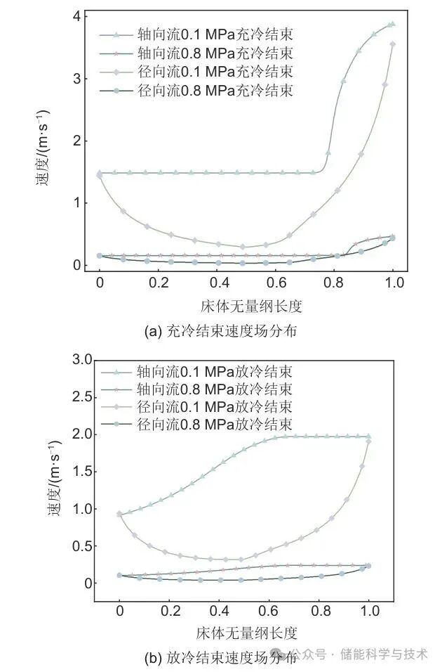 图4为流速随流体流动路径无量纲位置的变化图。图4(a)显示了在不同的流体工作压力下轴向流与径向流在充冷结束时,流速随流体流动路径无量纲位置的变化。对于轴向流填充床充冷过程,速度场分布呈明显分层特性。速度场变化与密度变化相关,流速改变集中于温跃层段,具体表现为密度降低驱动流速变化。在0.1 MPa工况下,流体速度由入口处1.48 m/s上升,最高至3.87 m/s,表明在温跃层内密度迅速下降,引起局部速度增强。相比之下,径向流填充床流速变化除了受密度影响外,还因自身结构特性使得在第一储罐内沿流动方向速度由1.5 m/s降至0.28 m/s,在第二储罐内沿流动方向速度由0.28 m/s升至3.55 m/s。速度场呈靠近内径区域速度较大,外径区域速度较低。该结构导致流体在流动过程中经历先减速后加速。