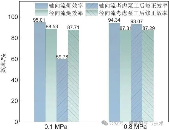 本研究对轴向流与径向流两种不同流动形式的填充床㶲效率及引入泵工后的修正效率进行了对比分析。如图8所示,展示了轴向流与径向流填充床在不同压力条件下的㶲效率及考虑泵功后的修正效率。在不考虑泵工影响的前提下,轴向流系统在0.1 MPa和0.8 MPa下的㶲效率分别为95.01%与94.34%,优于径向流的88.53%与87.31%,显示出其良好的热交换能力。在引入泵工后,轴向流在0.1 MPa下由于密度变化显著造成压降较大,结果为泵工上升,其修正后的㶲效率下降至59.78%,显著低于径向流的87.71%。而在0.8 MPa高压条件下,泵工对效率的影响减弱,轴径两种流动形式的㶲效率分别93.07%和87.29%,两者相差5.78%。