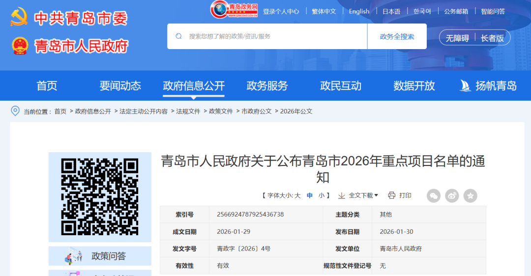 北极星风力发电网获悉,近日,山东省青岛市人民政府发布《关于公布青岛市2026年重点项目名单的通知》。
