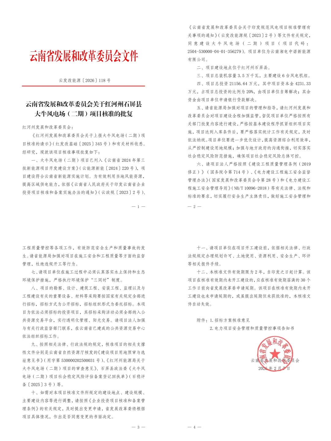 北极星风力发电网获悉,2月7日,由湖南能源集团新能源公司所属单位云南湘电中诺新能源有限公司申报的“云南省石屏县大牛风电场(二期)项目”(以下简称“大牛二期项目”)正式获得云南省发展和改革委员会核准批复。