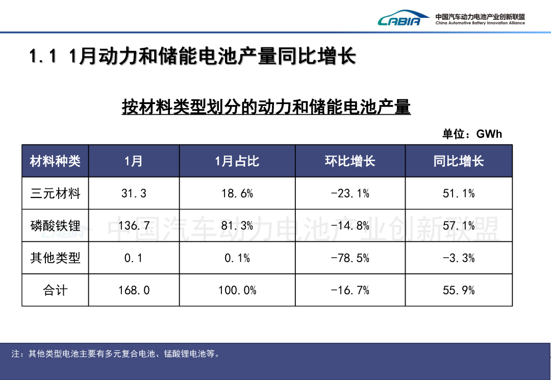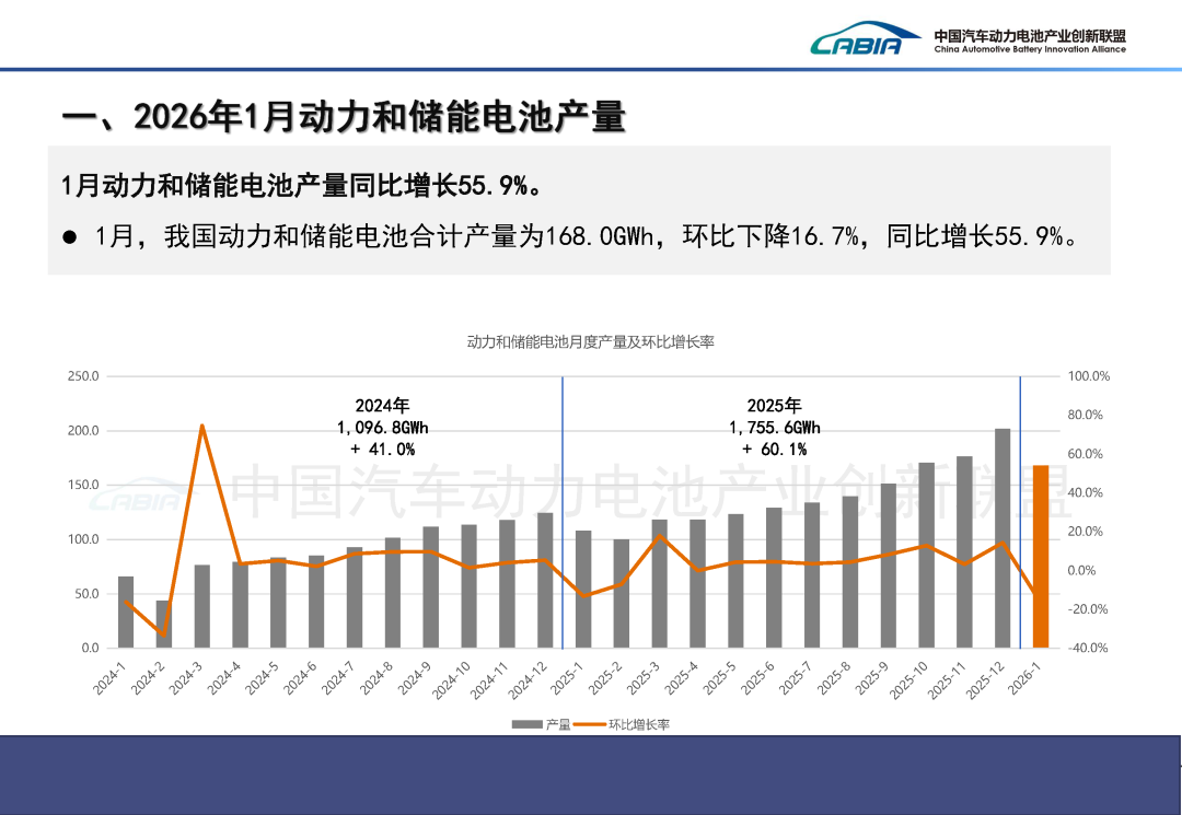 1月,我国动力和储能电池合计产量为168.0GWh,环比下降16.7%,同比增长55.9%。