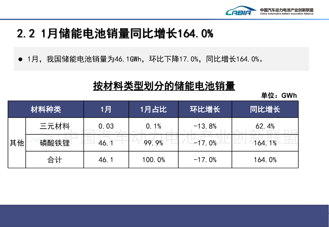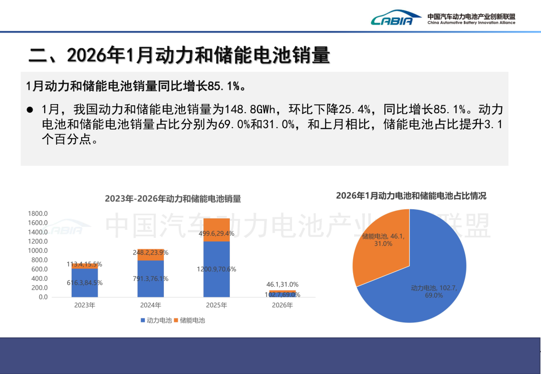 1月,我国动力和储能电池销量为148.8GWh,环比下降25.4%,同比增长85.1%。其中,动力电池销量为102.7GWh,占总销量69.0%,环比下降28.6%,同比增长63.2%;储能电池销量为46.1GWh,占总销量31.0%,环比下降17.0%,同比增长164.0%。