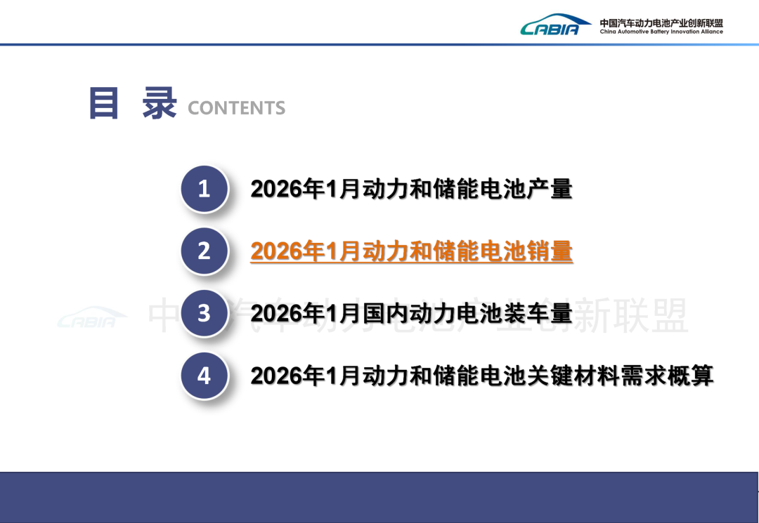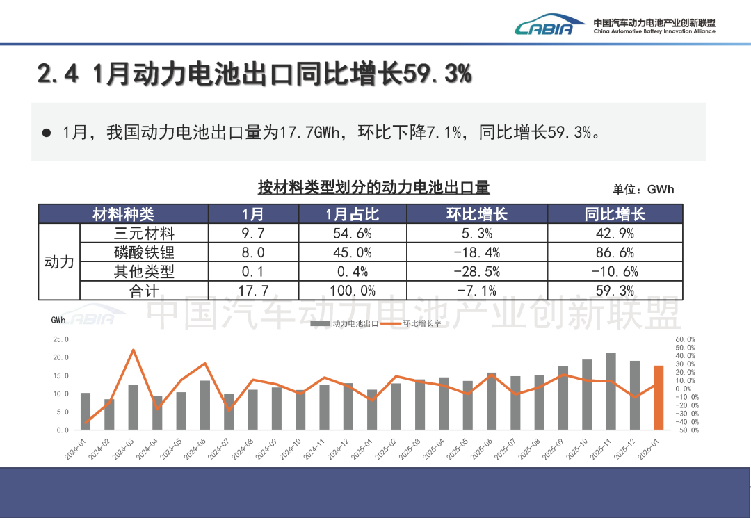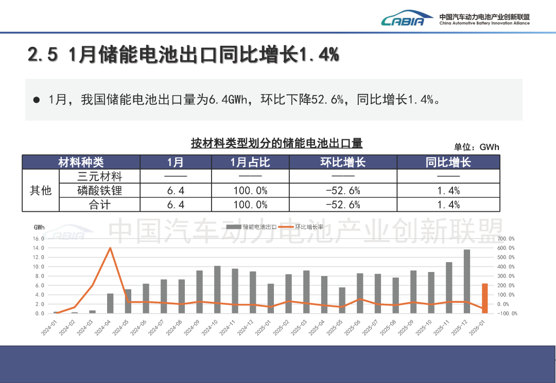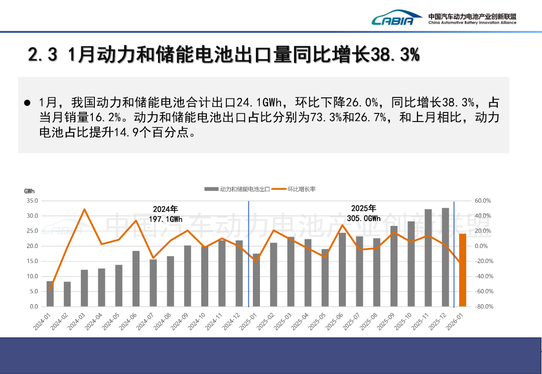 1月,我国动力和储能电池合计出口24.1GWh,环比下降26.0%,同比增长38.3%,占当月销量16.2%。其中,动力电池出口量为17.7GWh,占总出口量73.3%,环比下降7.1%,同比增长59.3%;储能电池出口量为6.4GWh,占总出口量26.7%,环比下降52.6%,同比增长1.4%。