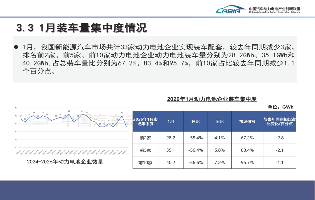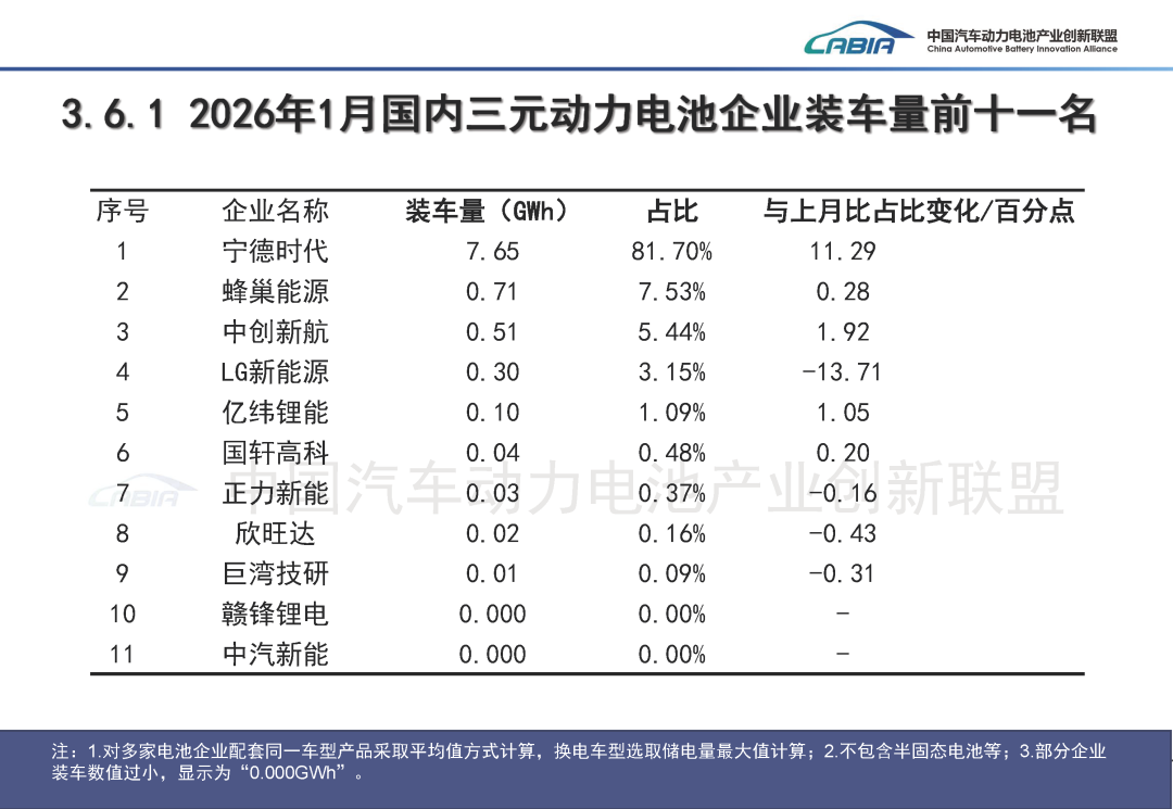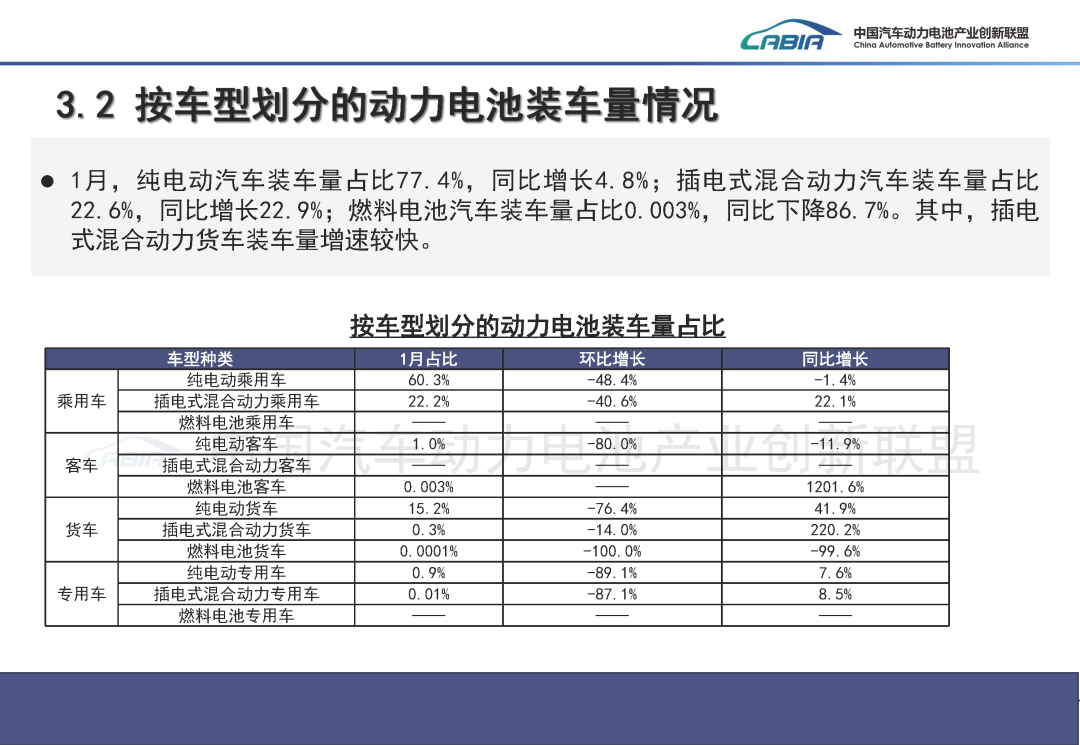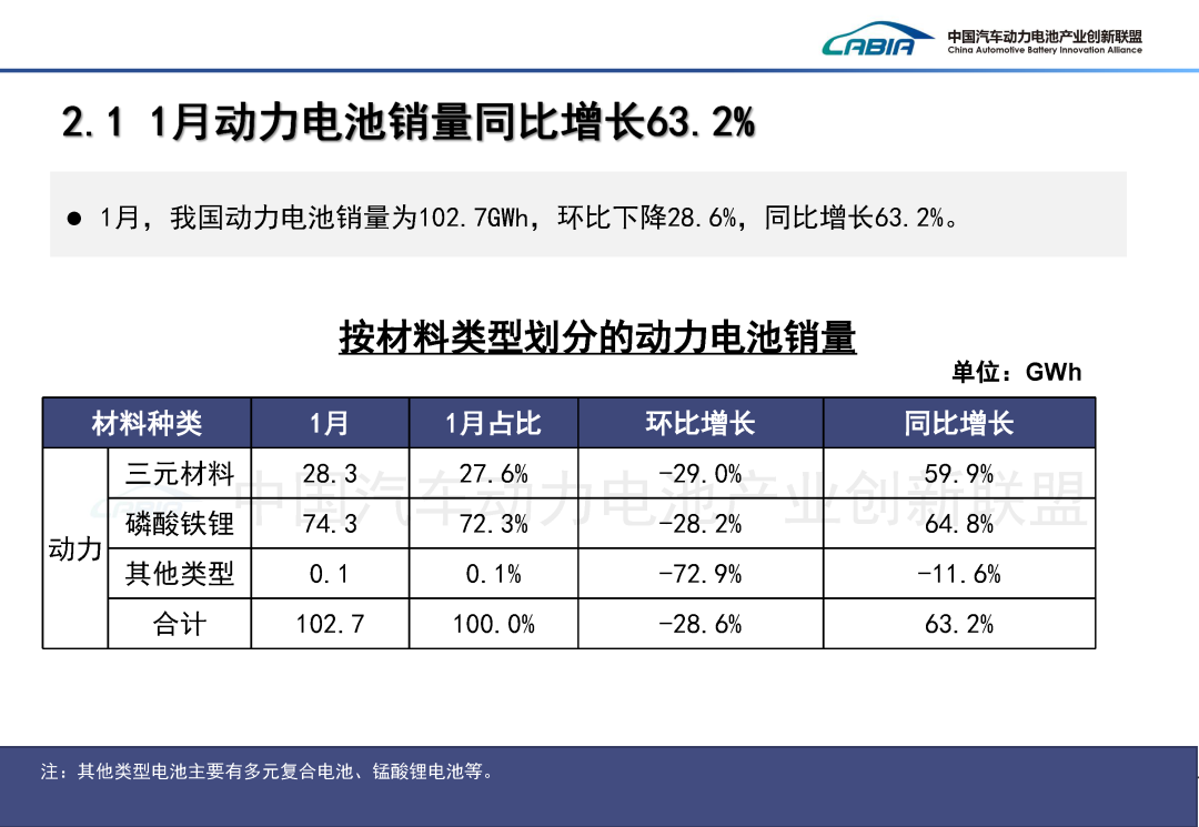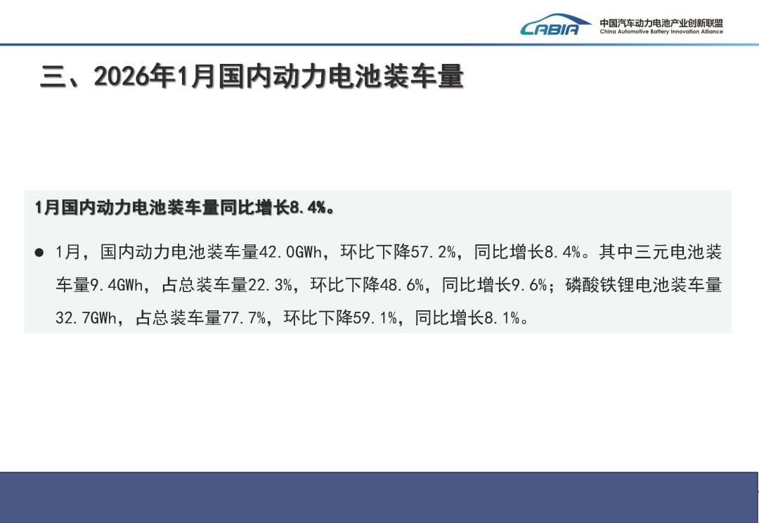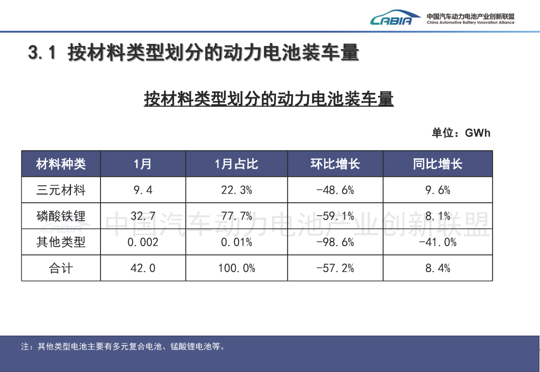 1月,国内动力电池装车量42.0GWh,环比下降57.2%,同比增长8.4%。其中三元电池装车量9.4GWh,占总装车量22.3%,环比下降48.6%,同比增长9.6%;磷酸铁锂电池装车量32.7GWh,占总装车量77.7%,环比下降59.1%,同比增长8.1%。