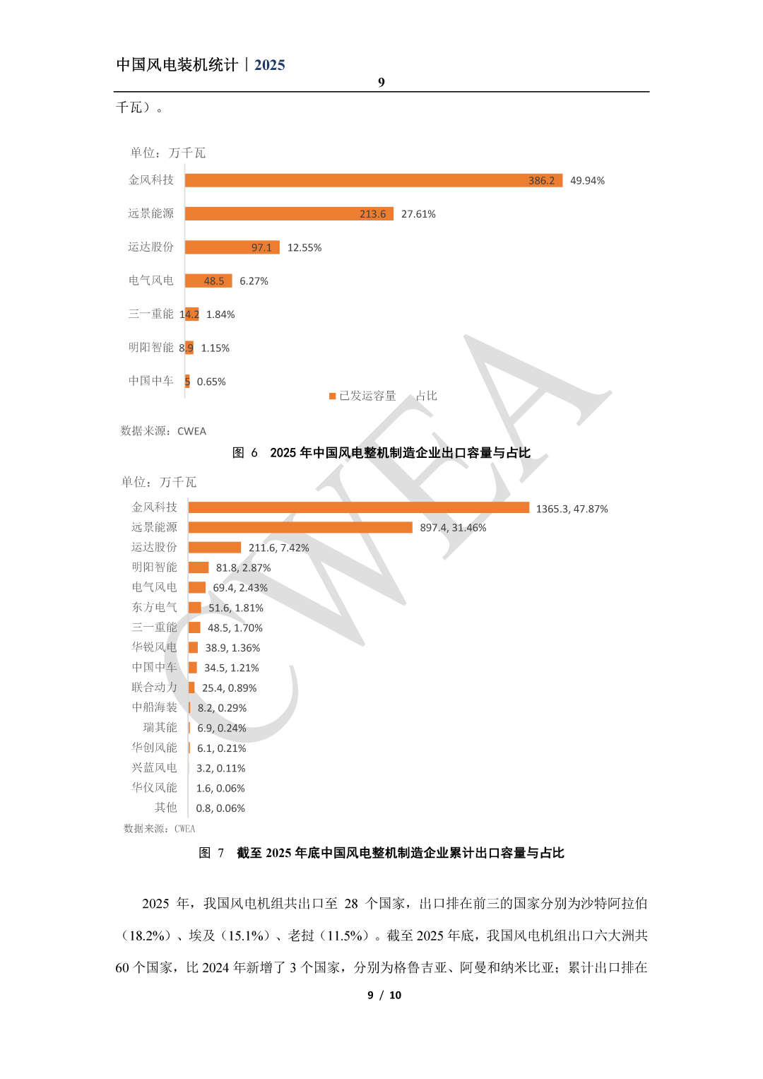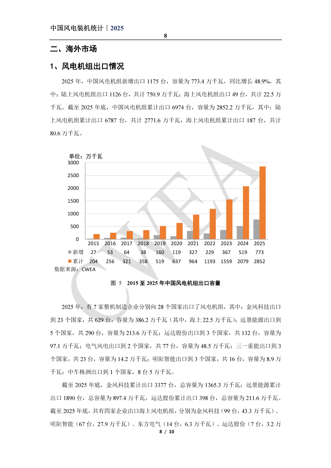 本统计中的“风电装机容量”是指“吊装容量”,指统计期内风电机组制造企业发货到风电场现场,施工单位完成风电机组所有部件吊装完毕、且完成安装验收或静态调试后的装机容量。