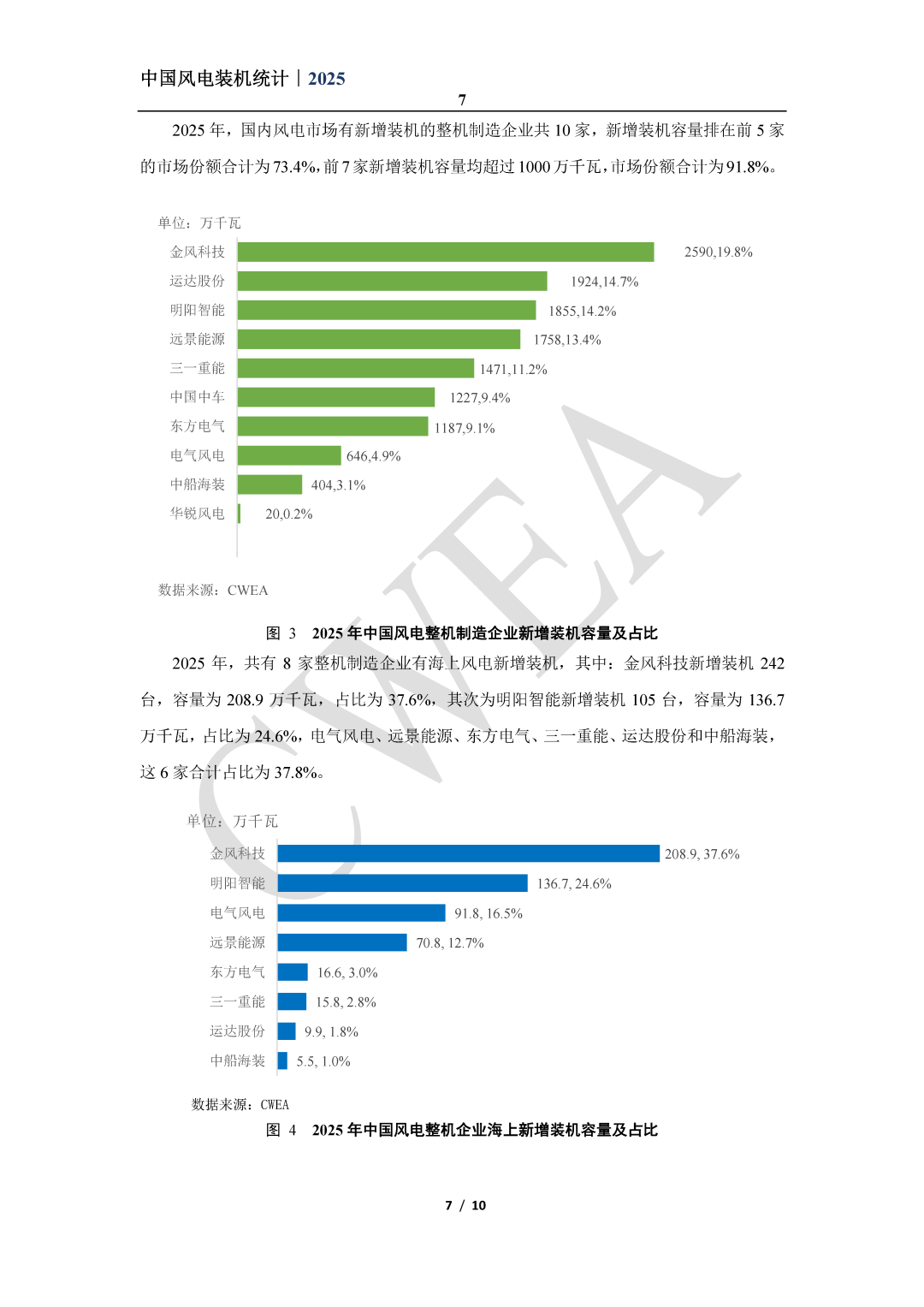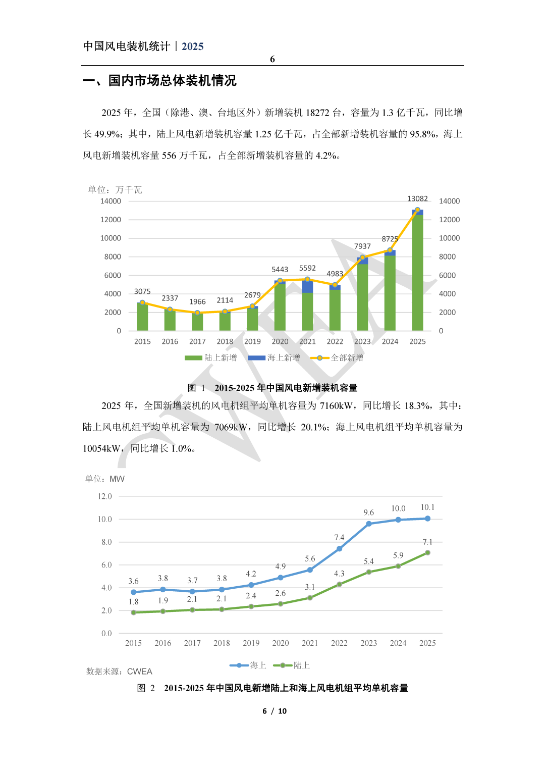 中国可再生能源学会风能专业委员会发布《2025年中国风电吊装容量统计简报》。2025年,全国(除港、澳、台地区外)新增装机18272台,容量为1.3亿千瓦,同比增长49.9%;其中,陆上风电新增装机容量1.25亿千瓦,占全部新增装机容量的95.8%,海上风电新增装机容量556万千瓦,占全部新增装机容量的4.2%。