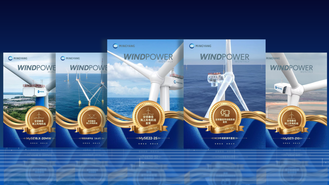 市场规模的突破与海外市场的拓展,离不开技术实力的底层支撑。日前,国际风电权威媒体Windpower Monthly 公布了2025年度“全球最佳风电机组”评选结果。明阳智能五款产品强势登榜,并一举摘得“全球最佳海上风电机组”与“全球最佳传动系统”两项金奖。这不仅是明阳连续第五年斩获海上机组金奖,更标志着中国风电企业从“规模引领”迈入“技术定义”的新阶段。