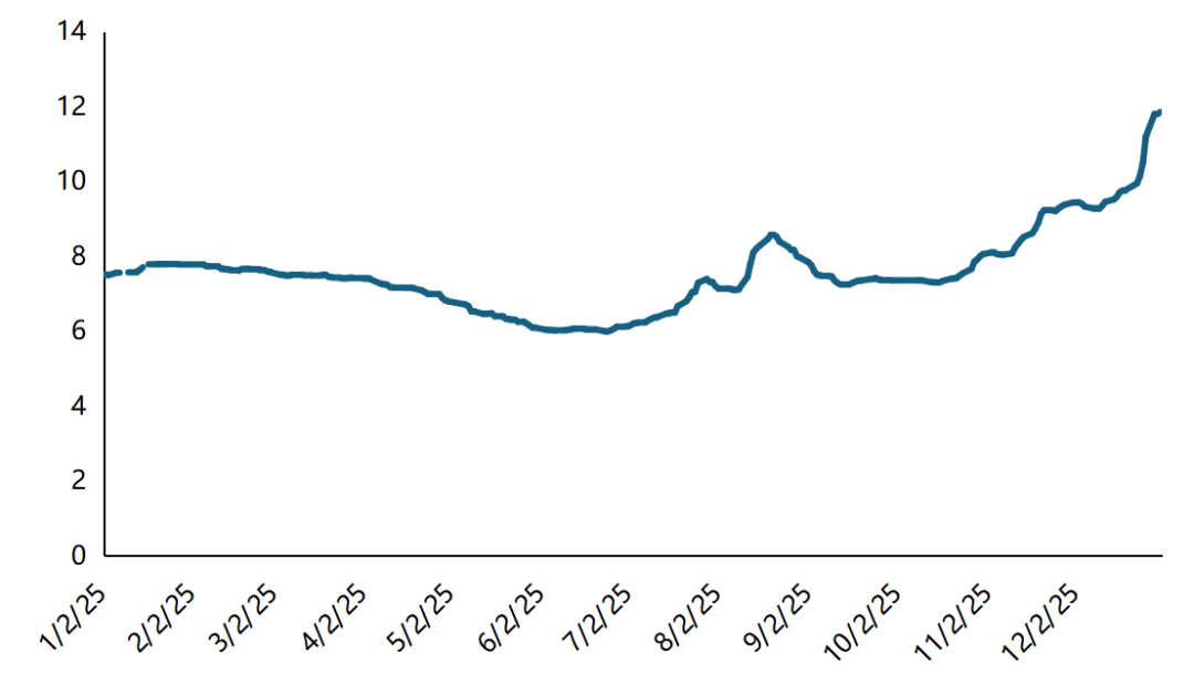 图:2025年1月-2025年12月电池级碳酸锂均价走势图(万元/吨)