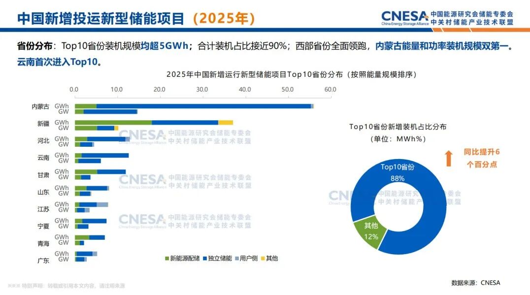 2025年,内蒙古凭借风光大基地的强劲需求,其能量与功率装机规模双双跃居中国首位,并一举超越美国加州,成为全球最大的区域储能市场。