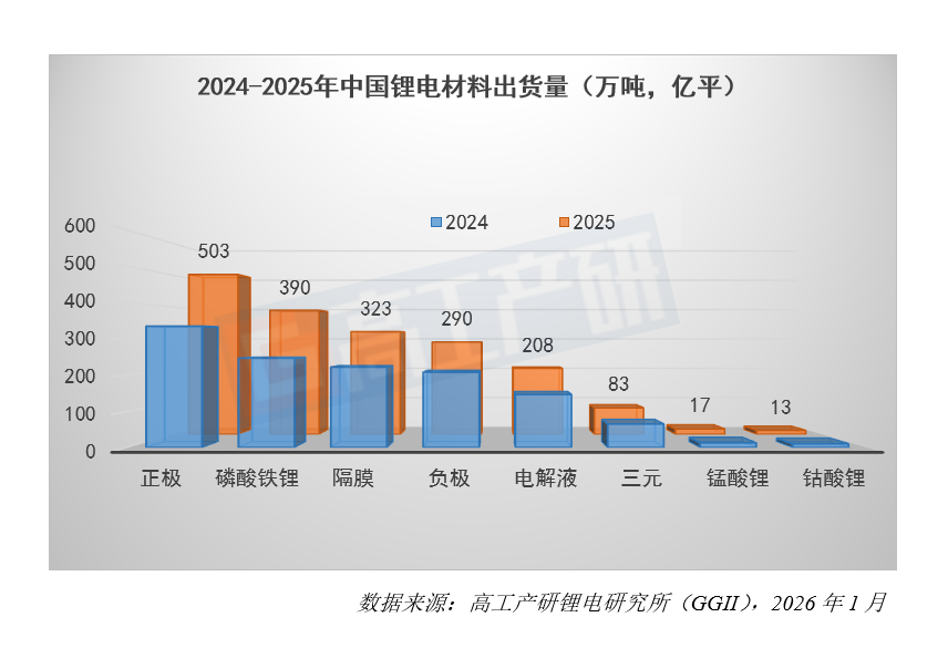 磷酸铁锂材料出货量领跑正极材料,海外市场带动三元材料出货增超25%,实现近3年来最高。据GGII初步调研数据显示,2025年中国正极材料出货量503万吨,同比增长50%。其中磷酸铁锂材料出货390万吨,同比增长58%;三元材料出83万吨,同比增长27%;钴酸锂与锰酸锂材料出货分别为12.5万吨、17万吨,同比增长分别为19%、31%。