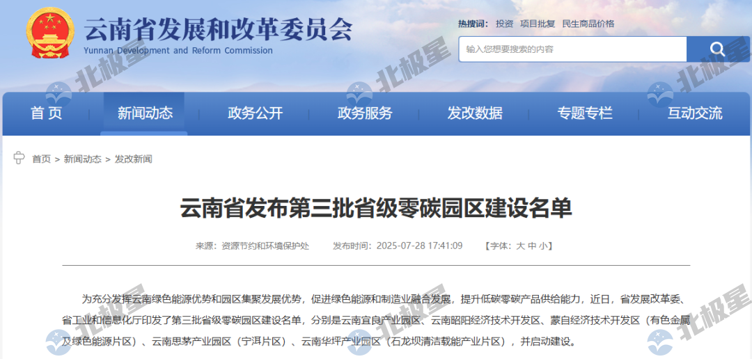 2025年7月,云南省发展改革委、省工业和信息化厅印发了第三批省级零碳园区建设名单,分别是云南宜良产业园区、云南昭阳经济技术开发区、蒙自经济技术开发区(有色金属及绿色能源片区)、云南思茅产业园区(宁洱片区)、云南华坪产业园区(石龙坝清洁载能产业片区)。