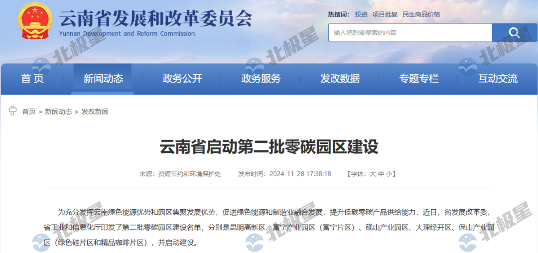 2024年11月,云南省第二批零碳园区建设名单引发,分别是昆明高新区、富宁产业园区(富宁片区)、砚山产业园区、大理经开区、保山产业园区(绿色硅片区和精品咖啡片区)。