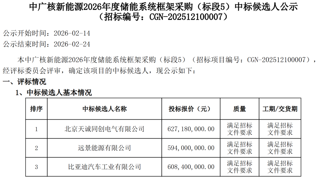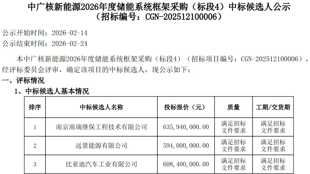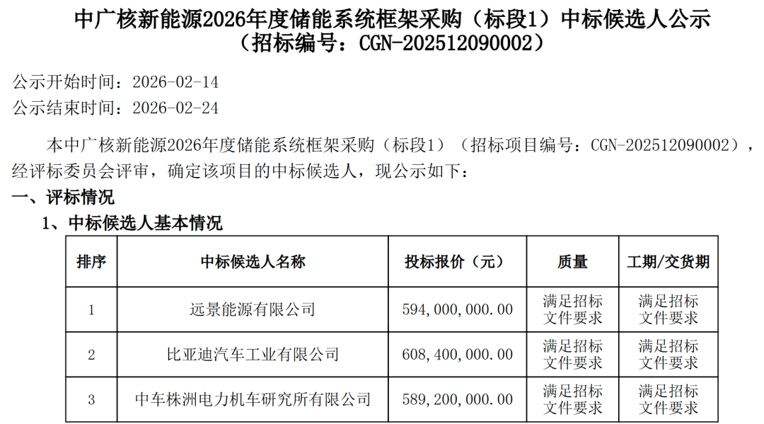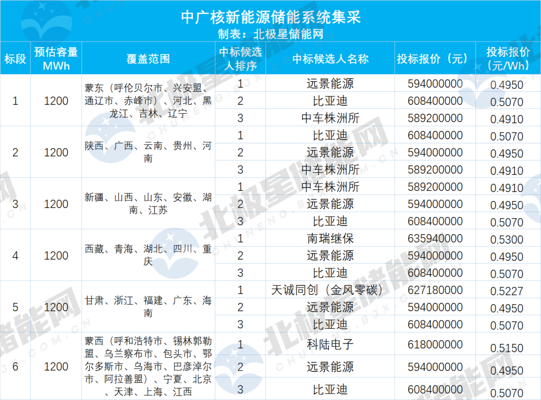 北极星储能网讯:2月14日,中广核7.2GWh储能系统集采中标候选人公示。共6家企业预中标,报价范围0.491~0.53元/Wh。其中远景能源、比亚迪中标了全部6个标段,中车株洲所中标参与前3个标段,南瑞继保、天诚同创(金风零碳)、科陆电子3家企业则各分别预中标1个标段。