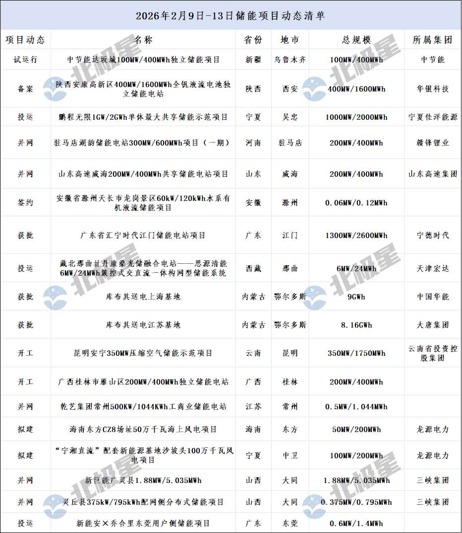 北极星储能网讯:2026年2月9日-13日,一周内共有18个储能项目披露最新动态,包括备案、获批、开工、并网等,涉及储能规模约3.9GW/27.1GWh。