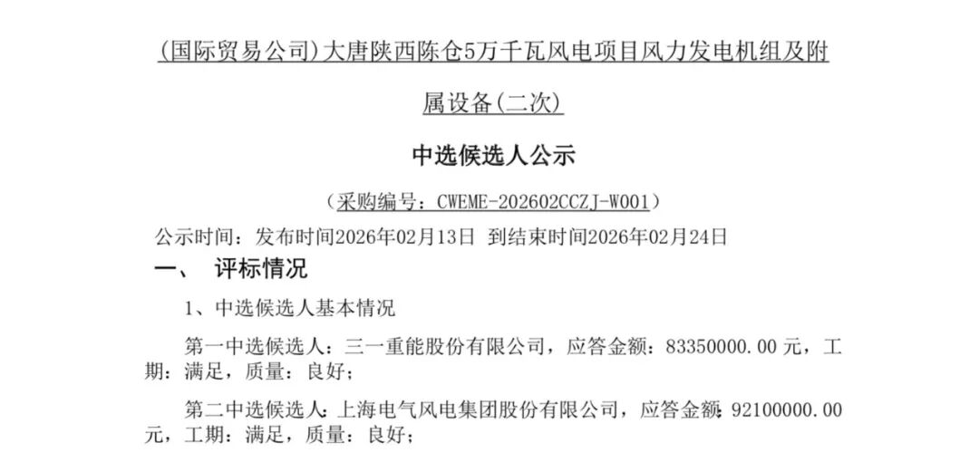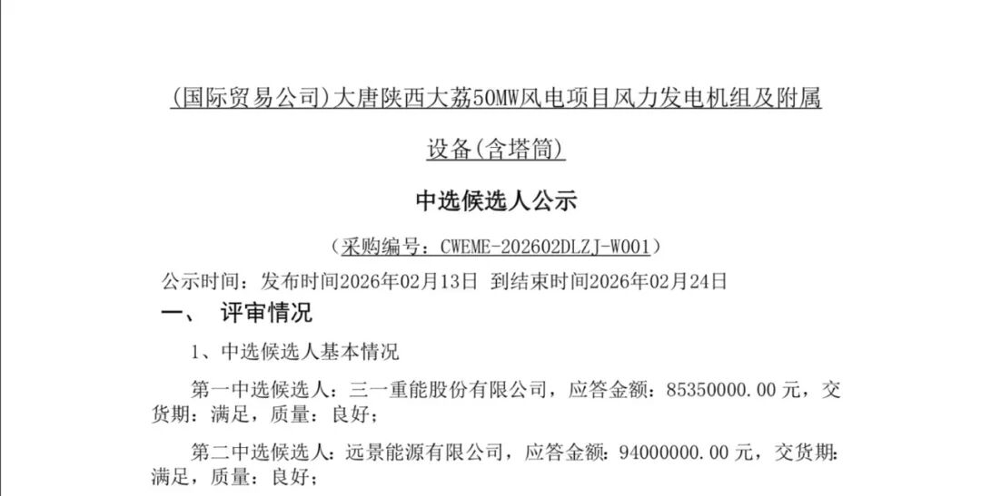 三一重能为大唐陕西陈仓5万千瓦风电项目中标候选人第一名,投标报价8335万元,折合单价1667元/kW。