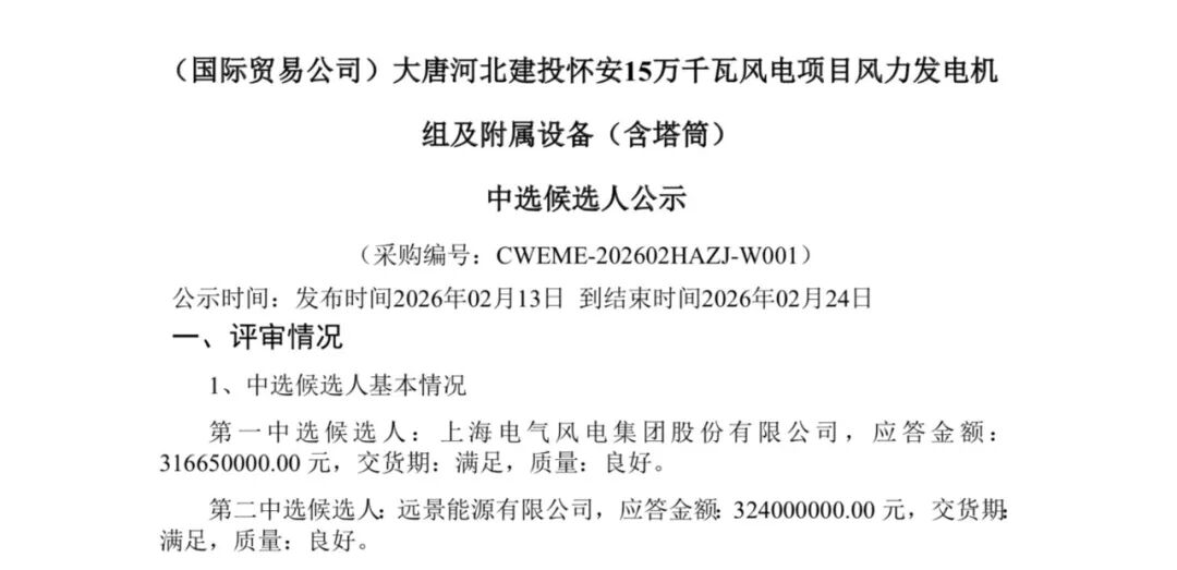 电气风电为大唐河北建投怀安15万千瓦风电项目中标候选人第一名,投标报价31665万元,折合单价2111元/kW。