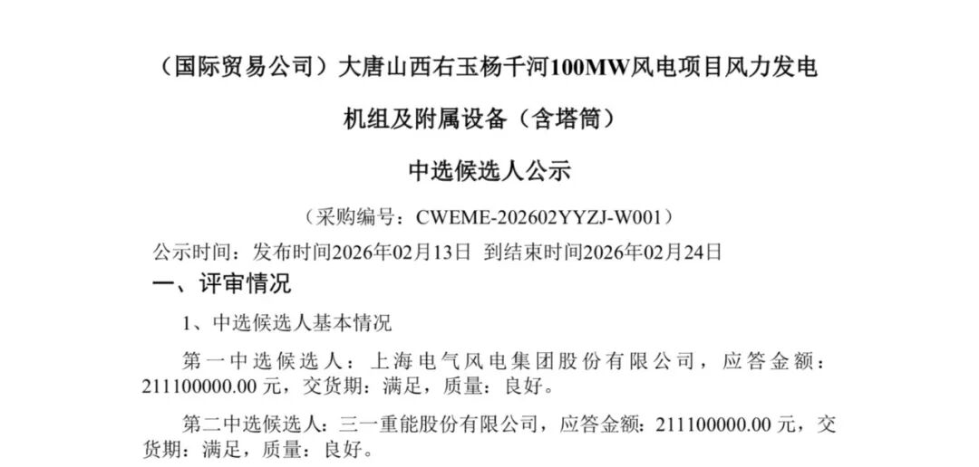 其中电气风电预中标250MW,三一重能预中标100MW。
