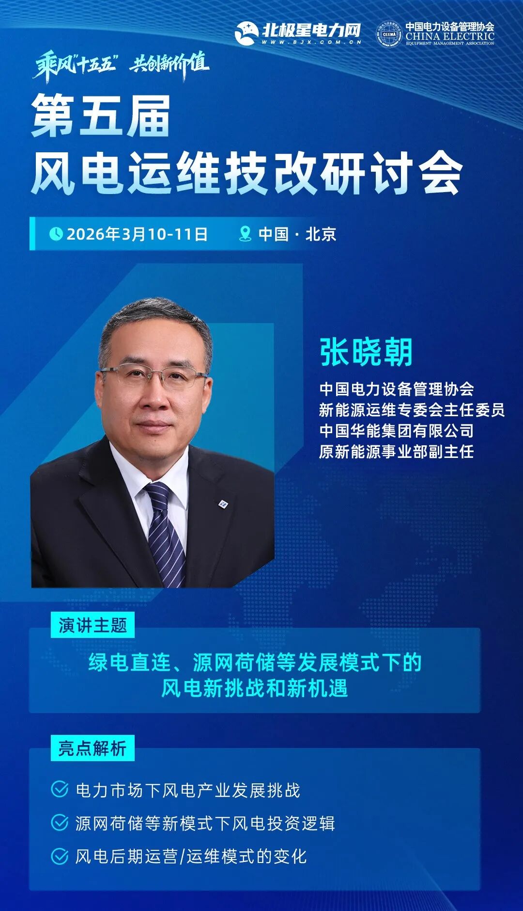 在会议上,中国电力设备管理协会新能源运维专委会主任委员、中国华能集团有限公司原新能源事业部副主任——张晓朝将演讲分享《绿电直连、源网荷储等发展模式下的风电新挑战和新机遇》。